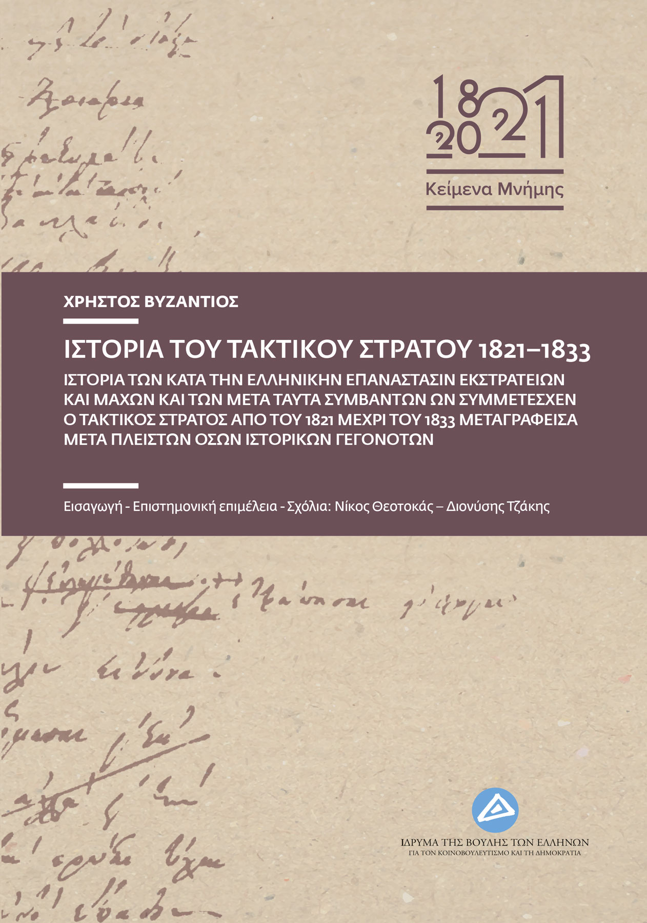 Μόλις κυκλοφόρησε, από τις εκδόσεις του Ιδρύματος Βουλής των Ελλήνων για τον Κοινοβουλευτισμό και τη Δημοκρατία, η Ιστορία του τακτικού στρατού της Ελλάδος 1821-1833 του Χρήστου Βυζάντιου, τρίτος τόμος της σειράς «Κείμενα Μνήμης» (διευθυντής: Παντελής Μπουκάλας), με εισαγωγή, επιστημονική επιμέλεια και σχόλια των ιστορικών Νίκου Θεοτοκά (Πάντειο Πανεπιστήμιο) και Διονύση Τζάκη (Ιόνιο Πανεπιστήμιο).
