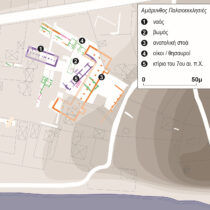 Εντός του απαλλοτριωμένου χώρου, ολοκληρώθηκε επίσης η ανασκαφή της μεγάλης υστεροκλασικής-ελληνιστικής στοάς. Το μνημειακού χαρακτήρα κτήριο, με 27 δωρικούς κίονες στην πρόσοψή του, έχει μήκος 69 μ. και περιέβαλλε το ιερό προς τα ανατολικά. Στα βόρεια, μια στοά και μία σειρά από τρία κτήρια μικρών διαστάσεων οριοθετούσαν το τέμενος. Πρόκειται ίσως για «θησαυρούς» ή ναΐσκους, που παρουσιάζουν κάτοψη παρόμοια με ανάλογα κτήρια σε άλλα μεγάλα ελληνικά ιερά. Από την έρευνα στα κτήρια δεν υπήρξαν ευρήματα που θα μπορούσαν να προσδιορίσουν τη χρήση τους, εκτός από ένα θραύσμα μαρμάρινης βάσης αγάλματος με αναθηματική επιγραφή, όπου εμφανίζεται η αρχή του ονόματος της Αρτέμιδος. Το ένα από αυτά τα κτήρια καταστράφηκε από τη δημιουργία ασβεστοκάμινου κατά τα μεσαιωνικά, πιθανόν, χρόνια.