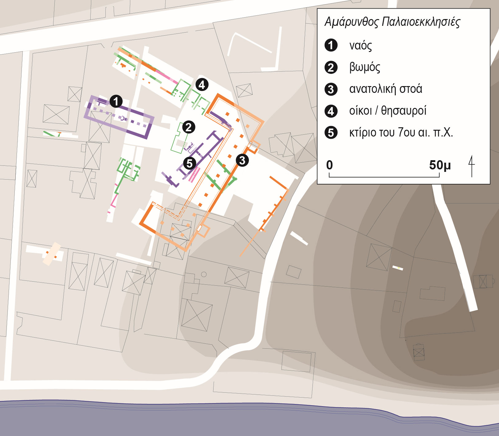 Σε ό,τι αφορά τον υστεροαρχαϊκό ναό που εντοπίστηκε κατά τη φετινή ανασκαφική περίοδο, πρόκειται για κτήριο διαστάσεων 10×30 μ. με μία κιονοστοιχία στον κεντρικό άξονα, από το οποίο σώζεται το συμπαγές θεμέλιο, στο εσωτερικό του οποίου βρέθηκε τοίχος προγενέστερης φάσης και εσχάρα με ίχνη φωτιάς. Κατά το τελευταίο τέταρτο του 6ου αι. π.X. σε επαφή με τα θεμέλια του κτηρίου εναποτέθηκαν αναθήματα του 7ου και 6ου αι. π.Χ. και συγκεκριμένα μελανόμορφα αγγεία (όπως ένας αμφορέας με παράσταση Μέδουσας), πήλινα ειδώλια, σφραγιδόλιθοι σε σχήμα σκαραβαίου και ειδώλια από φαγεντιανή εισηγμένα από την Ανατολική Μεσόγειο, αλλά και αγγεία τοπικής παραγωγής όπως πρόχοι με ψηλό λαιμό και υδρίσκες, όμοιου τύπου με αγγεία που έχουν βρεθεί σε μεγάλο αριθμό στις ανασκαφές των αρχαϊκών χώρων λατρείας γυναικείων θεοτήτων στην Ερέτρια. Τα εν λόγω ευρήματα τεκμηριώνουν τη συμμετοχή του ιερού της Αμαρυσίας Αρτέμιδος στις θρησκευτικές πρακτικές των Ερετριέων και των Ευβοέων γενικότερα, καθώς και τις εμπορικές σχέσεις της περιοχής της Αμαρύνθου με την Ανατολική Μεσόγειο.