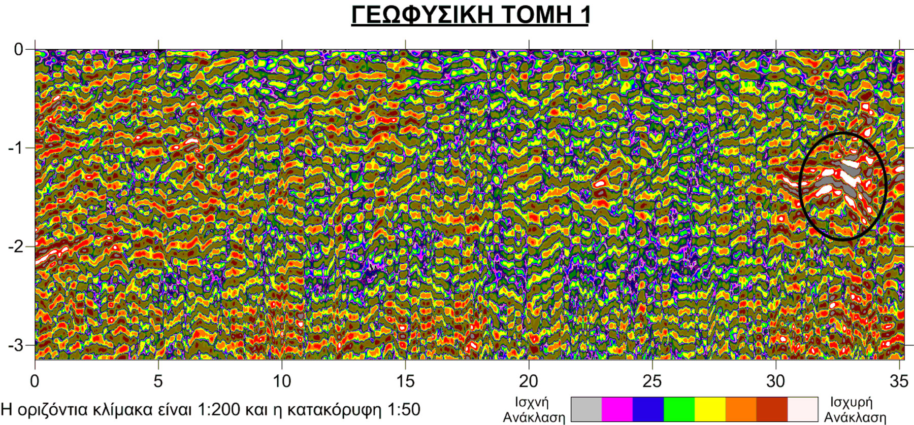 Ενδεικτικά αναφέρεται το βορειοδυτικό τμήμα όπου απαντούν πολύ ισχυρές ανακλάσεις και ένα υπεδαφικό κενό (σημείο που τέμνεται η 1η και 8η γεωφυσική τομή) καθώς και ο παράπλευρος αγροτικός δρόμος (τομή 23), όπου οι ανακλάσεις σχετίζονται με ανθρώπινες κατασκευές (κτίρια ή τοίχους) (εικ. 2, 3).