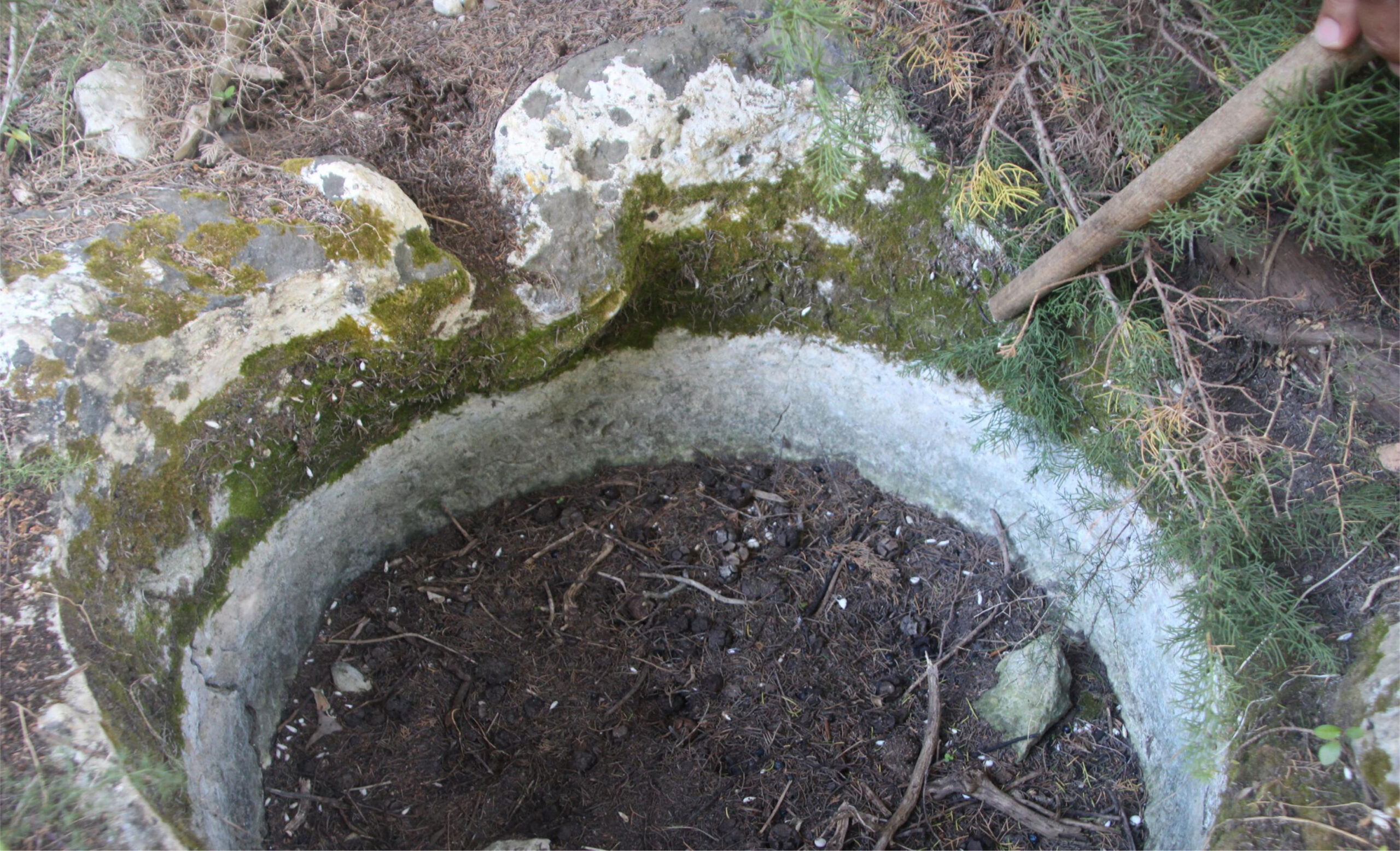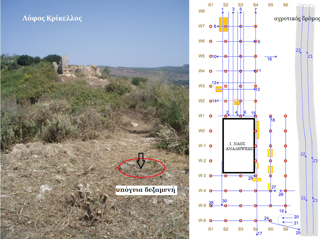 Στην κορυφή του Κρίκελου εντοπίστηκε υπόγεια αποθήκη (δεξαμενή) βάθους 5 μ., με ορθογώνιο στόμιο, λαξευμένη μέσα στο ασβεστολιθικό του υπόβαθρο (εικ. 4α). Ενώ, κατά τη διάρκεια της επισκόπησης εντοπίστηκε στις παρειές του λόφου αρχαίο πηγάδι, με λαξευμένο ορθογώνιο ασβεστολιθικό στόμιο και καθαρό πόσιμο νερό (εικ. 4β).