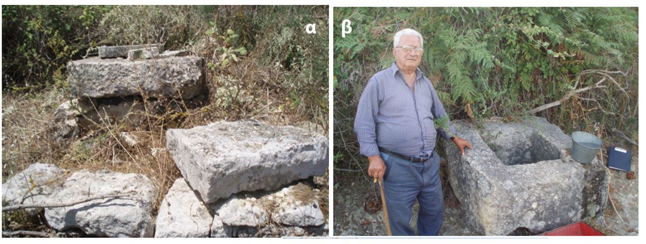 Κατά την επισκόπηση της περιοχής εντοπίστηκαν πολύ σημαντικά επιφανειακά ευρήματα αρχαιολογικού ενδιαφέροντος, όπως π.χ. ένα πατητήρι σταφυλιών λαξευμένο στον βράχο, κτίσματα με λαξευμένα σκαλοπάτια εισόδου και λαξευμένες λεκάνες στο εσωτερικό δάπεδο (εικ. 7α, β, γ), καθώς επίσης και ανοιγμένοι ταφικοί θάλαμοι.