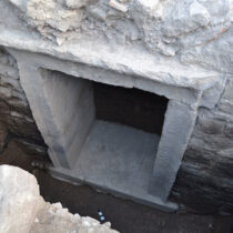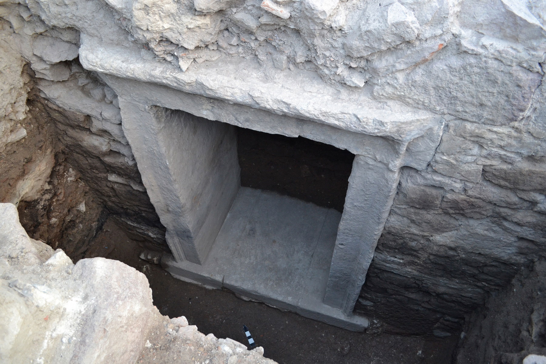 Για την ανάδειξη και την προστασία του μνημείου, το οποίο θα είναι ορατό στους επισκέπτες, διερευνήθηκε ο χώρος δυτικά αυτού, όπου και εντοπίστηκε τμήμα ισχυρού τείχους πάνω στο οποίο εδράζεται ο δυτικός τοίχος του λουτρού, καθώς και μαρμάρινη πύλη εισόδου, η οποία σύμφωνα με τα ευρήματα χρονολογείται στους πρωτοβυζαντινούς χρόνους. Η πύλη έχει συνολικό ύψος 3,20 μ., πλάτος 2,05 μ. και βάθος 2 μ. Για την κατασκευή της χρησιμοποιήθηκαν συνολικά 9 πλάκες εντόπιου γκριζόλευκου μαρμάρου, συναρμοσμένες με κονίαμα, ενώ κοιλότητες στο υπέρθυρο υποδηλώνουν την ύπαρξη ξύλινης θύρας, προσαρμοσμένης με στροφείς. Οι παραστάδες της κοσμούνται με ταινία και κοιλόκυρτο κυμάτιο, ενώ το υπέρθυρο φέρει κυρτό γείσο. Στο κατώφλι διακρίνεται οριζόντια, ανάγλυφη, κυρτή ταινία. Στο εσωτερικό της διατηρείται μέρος πρόχειρου τειχίσματος για την αντιστήριξη του δαπέδου του κύριου, θερμού δωματίου του λουτρικού συγκροτήματος. Η επίχωση που αφαιρέθηκε για την αποκάλυψη της πύλης περιείχε κυρίως στρώματα καύσης και στάχτες λόγω της γειτνίασης με τον θερμό χώρο του λουτρού, και απέδωσε άβαφη χρηστική και εφυαλωμένη κεραμική κατά κανόνα βυζαντινών χρόνων, καθώς και χάλκινα νομίσματα (φόλλεις) του 6ου και 7ου αιώνα που εντοπίστηκαν κοντά στο κατώφλι.