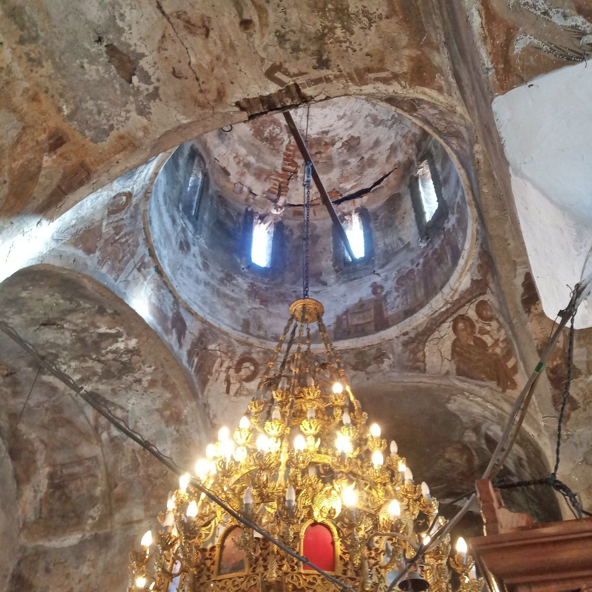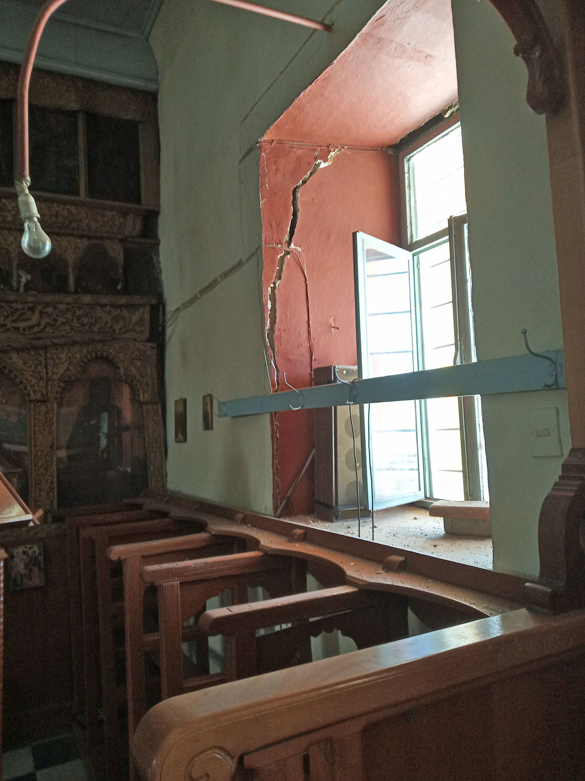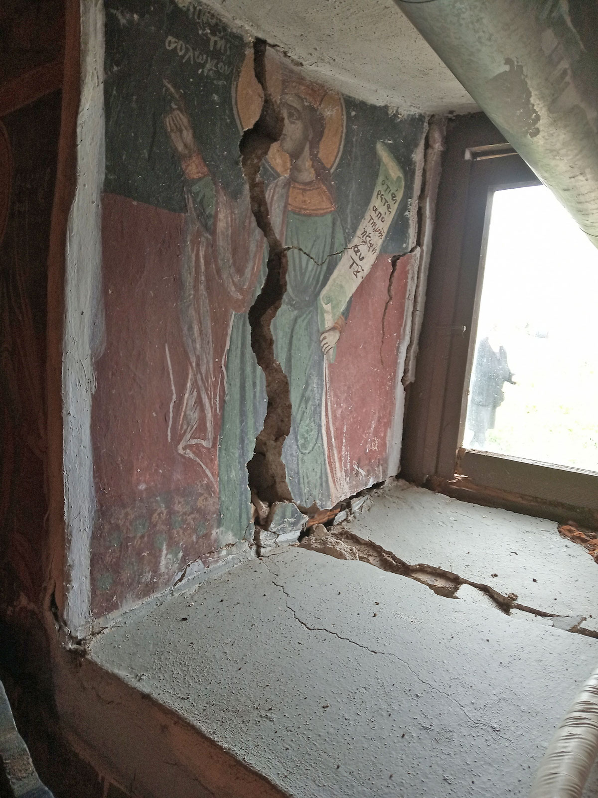 – Στη μονή του Προφήτη Ηλία αποκολλήθηκε ο βόρειος τοίχος από τη στέγη, ενώ παρατηρείται οριζόντιο σκίσιμο στο άνω μέρος του τρούλου. Ρωγμές υπάρχουν στις περισσότερες καμάρες του ναού. Χρήζει άμεσων μέτρων στήριξης.
