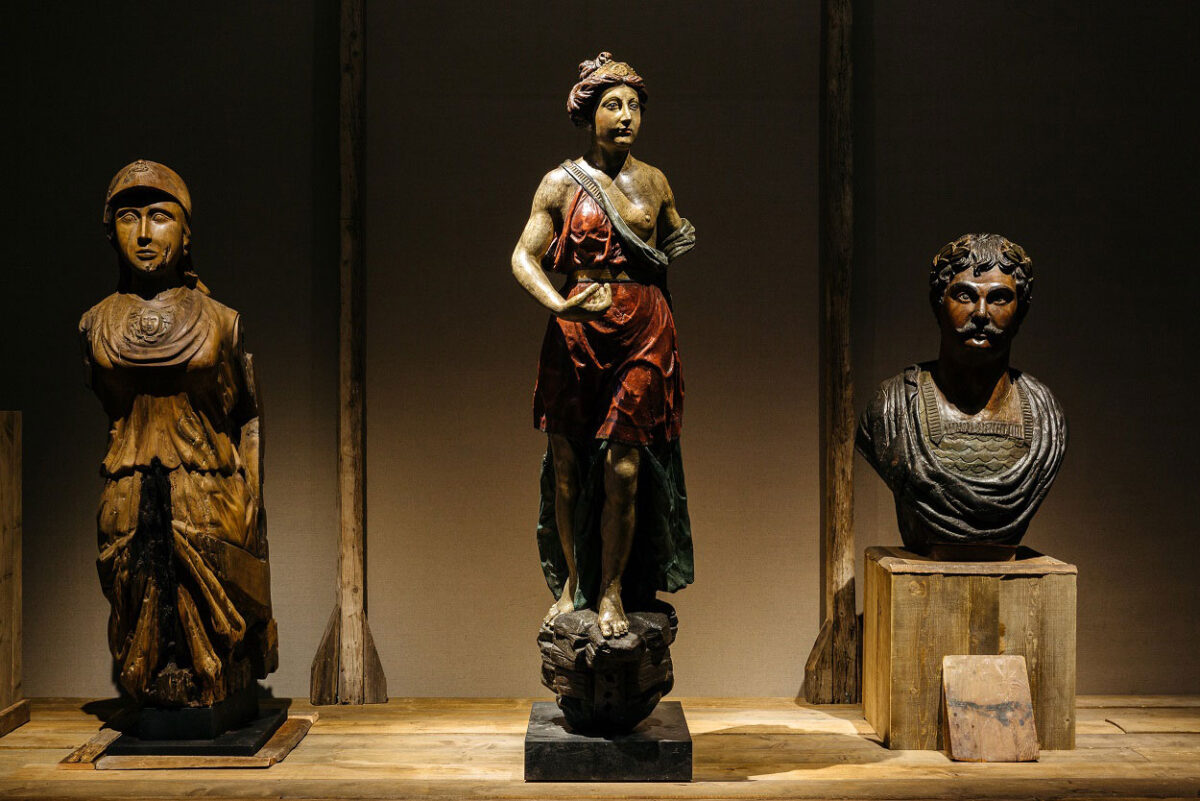Από τoυς «διαλόγους» των εκθεμάτων, το βλέμμα του επισκέπτη αιχμαλωτίζει η εμβληματική παρουσία του μαρμάρινου αγάλματος της πληγωμένης Αμαζόνας από τα Μουσεία του Καπιτωλίου της Ρώμης, έργο του 2ου αι. μ.Χ., ρωμαϊκό αντίγραφο πρωτότυπου έργου του 5ου αι. π.Χ., πιθανότατα του γλύπτη Πολύκλειτου, σε διάλογο με το ξύλινο ακρόπρωρο με μορφή Αμαζόνας, έργο του Γάλλου Douin Pete του τέλους του 18ου αιώνα, από τη Συλλογή Μαρτίνου. Το μικρό λίθινο άγαλμα Αθηνάς του 2ου αι. μ.Χ., από την Αρχαία Ελεύθερνα και το Αρχαιολογικό Μουσείο του Ρεθύμνου συνδιαλέγεται με το ακρόπρωρο με τη μορφή Αθηνάς, των αρχών του 19ου αιώνα της Συλλογής Μαρτίνου. Το εκμαγείο με την προτομή του Στρατηγού Θεμιστοκλή του 2ου αι. μ.Χ. από το Αρχαιολογικό Μουσείο της Όστια ανακαλεί το ακρόπρωρο με προτομή του Θεμιστοκλή των αρχών του 19ου αιώνα της Συλλογής, ενώ το αγαλμάτιο του Οδυσσέα, αντίγραφο της Ρωμαϊκής Αυτοκρατορικής Εποχής από το Εθνικό Αρχαιολογικό Μουσείο της Βενετίας, συνομιλεί με το γλυπτό του Οδυσσέα Ανδρούτσου με τον σκύλο του, του Βenedetto Sangiovanni του 1836. Τέλος, η ερμαϊκή στήλη της Σαπφούς που φέρει την επιγραφή «ΣΑΠΦΩ ΕΡΕΣΙΑ» του 1ου αι. μ.Χ. από τα Μουσεία του Καπιτωλίου της Ρώμης και η Αττική ερυθρόμορφη υδρία με παράσταση γυναίκας μουσικού (Σαπφούς) του 440-430 π.Χ. από το Εθνικό Αρχαιολογικό Μουσείο συνδιαλέγονται με το επιτραπέζιο ρολόι Η Madame de Stael ως Σαπφώ, του 1830, της Συλλογής.