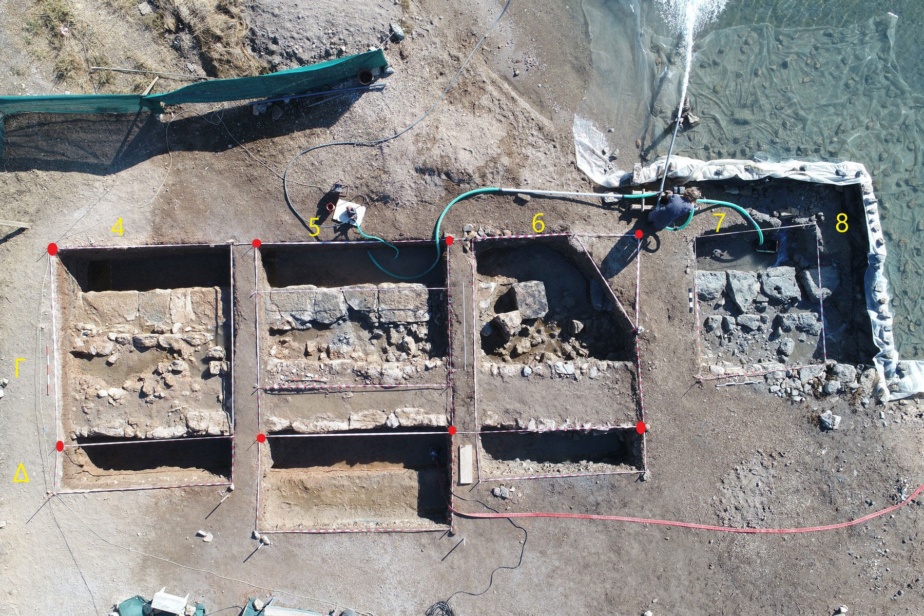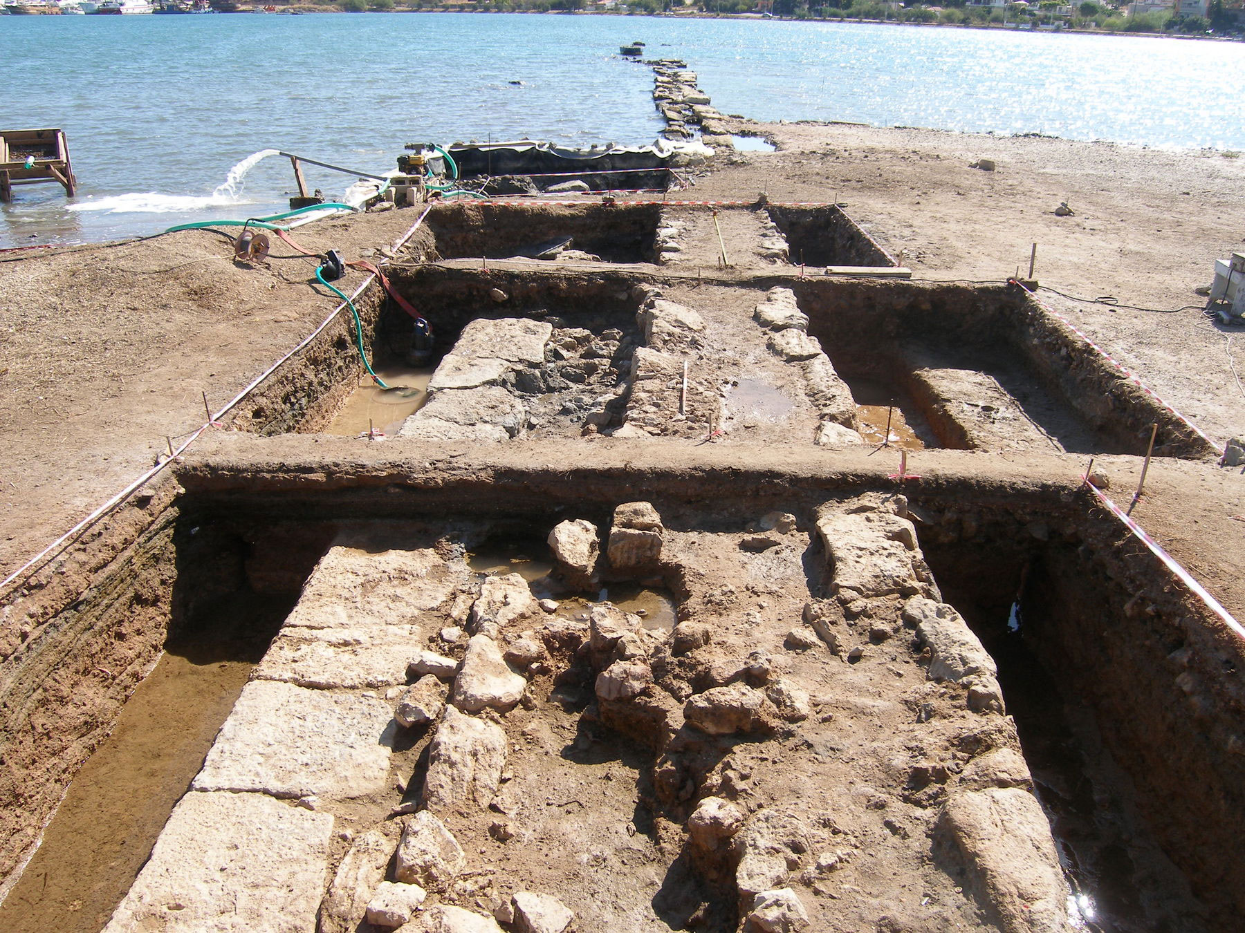 Για την πλήρη διερεύνηση του εντοπισθέντος σκέλους του τείχους εφαρμόσθηκαν μέθοδοι και τεχνικές της χερσαίας και υποβρύχιας αρχαιολογίας, με την καθημερινή χρησιμοποίηση 2 υδραντλιών, ενώ στο νοτιότερο ανασκαφικό τετράγωνο χρειάστηκε να κατασκευαστεί φράγμα από λίθους (με εξωτερική στεγανοποιητική «ποδιά» από φύλλο πλαστικού) σε σχήμα Γ, για την απάντληση των υδάτων, με πολύ καλά αποτελέσματα.