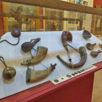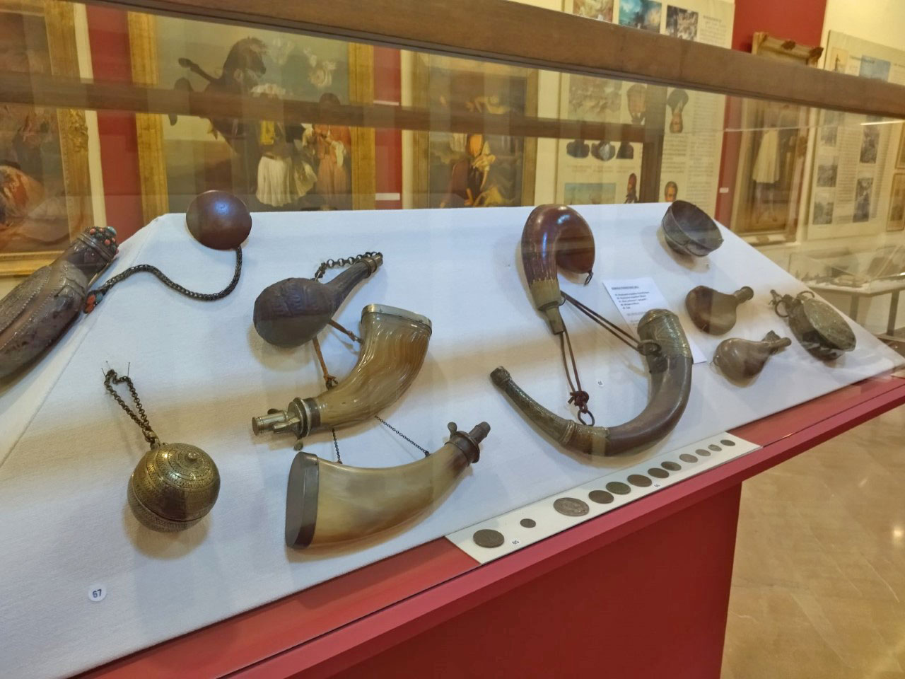 «Σε άλλη προθήκη παρουσιάζεται συλλογή από σπάθες, πιστόλες ή κουμπούρες, όπως ονομάζονταν, από την οθωμανική λέξη kubur, με μπρούντζινα ή αργυρά ενθέματα. Είναι σπάνιο να βρεθούν δύο όμοιες πιστόλες, γι’ αυτό και η αξία τους είναι πάντα ιδιαίτερη», επισημαίνει ο κ. Νικόλτσιος σημειώνοντας πως τα όπλα των βαθμοφόρων μαχητών ήταν κατασκευασμένα από ποιοτικότερα υλικά.