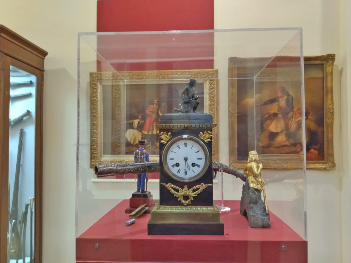 Ένα φιλελληνικό ρολόι και μια πιστόλα από καθαρό ασήμι αντιπροσωπεύουν εικαστικά έργα γλυπτικής και χρυσοχοΐας, που άφησε πίσω της η Επανάσταση.
