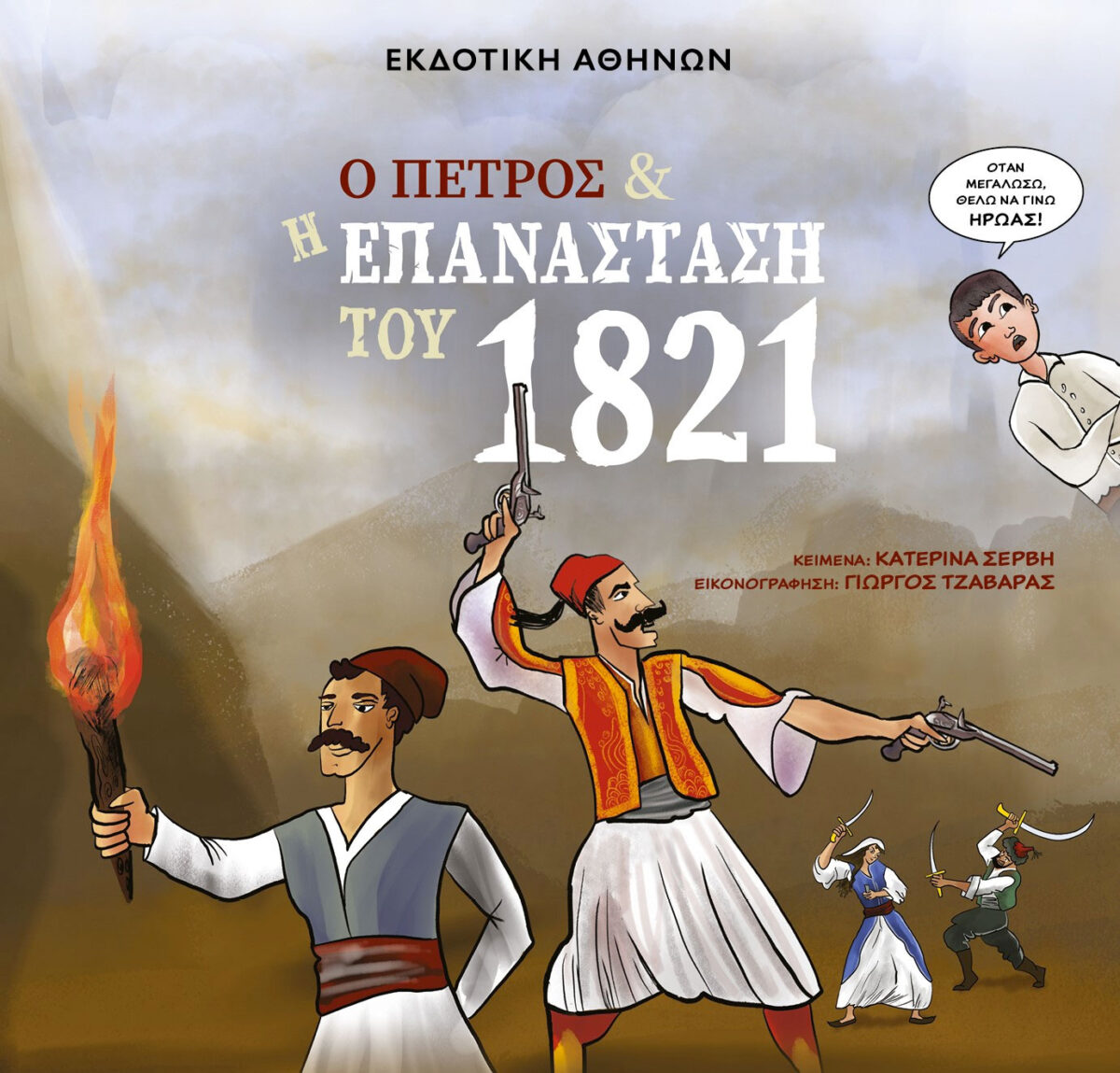 Ο Πέτρος και η Επανάσταση του 1821, κείμενα: Κατερίνα Σέρβη, εικονογράφηση: Γιώργος Τζαβάρας, Εκδοτική Αθηνών, Αθήνα 2021, 44 σελ. ISBN: 978-960-213-473-3