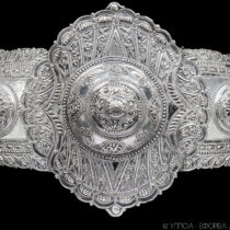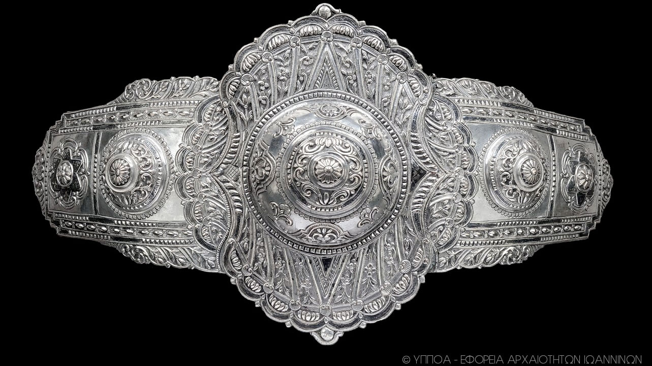 Από το «σύμπαν» της γυναίκας, αυτήν τη φορά στον βαλκανικό χώρο του 19ου αιώνα, προέρχεται και το έκθεμα το οποίο έχει επιλέξει και σχολιάζει για τις σημασιοδοτήσεις μιας λεπτομέρειάς του η αρχαιολόγος Αθηνά Ζωγάκη. Πρόκειται για αργυρή ζώνη (Δωρεά – Συλλογή Κ. Ιωαννίδη) με χαρακτηριστικές μικροσκοπικές κεφαλές με ανθρώπινα χαρακτηριστικά στην άνω και κάτω απόληξη του κεντρικού στελέχους του βαρύτιμου και περίτεχνου κοσμήματος. Περιλαμβάνεται στην Έκθεση Αργυροχοΐας του Βυζαντινού Μουσείου Ιωαννίνων, στο κτήριο του «Θησαυροφυλακίου», στην εσωτερική ακρόπολη Ιτς Καλέ του Κάστρου.