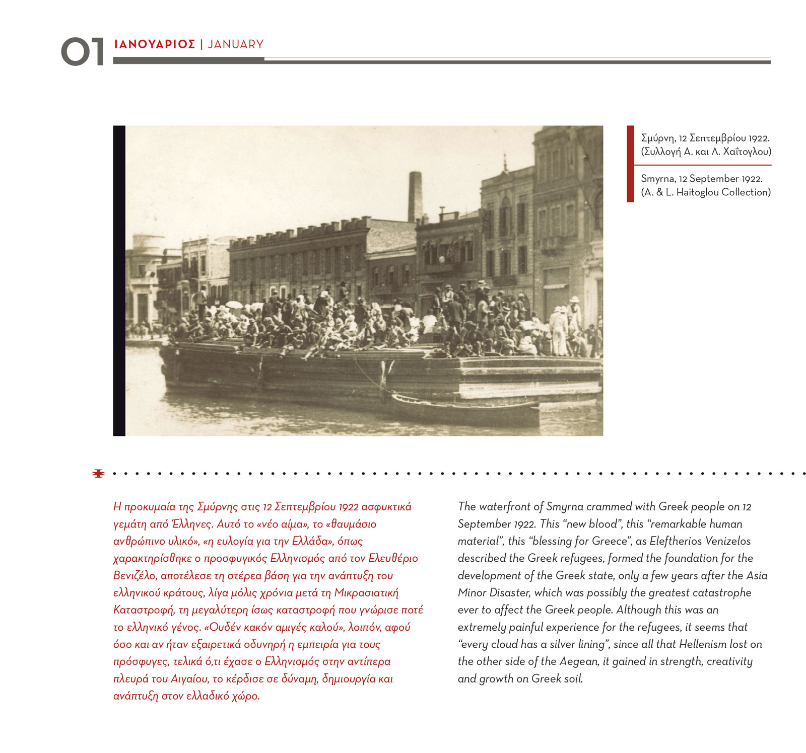 Το δίγλωσσο (ελληνικά και αγγλικά) επιτραπέζιο ημερολόγιο-λεύκωμα είναι αφιερωμένο στην επέτειο των 100 χρόνων από τον ξεριζωμό των Ελλήνων από τις εστίες τους και την αναζήτηση μιας νέας πατρίδας, με σπάνιο φωτογραφικό και αρχειακό υλικό από συλλέκτες και φορείς της Μακεδονίας.