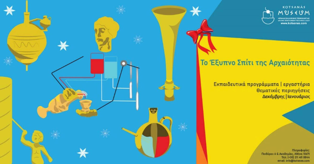 Το «Έξυπνο Σπίτι της Αρχαιότητας» ανοίγει τις πόρτες του στο Μουσείο Κοτσανά για να υποδεχτεί μικρούς και μεγάλους με εορταστική διάθεση και πολλές εκπλήξεις. Το Μουσείο Κοτσανά φορά τα γιορτινά του και δίνει ραντεβού τον Δεκέμβριο και τον Ιανουάριο της νέας χρονιάς με ένα πολλά υποσχόμενο εορταστικό πρόγραμμα εκδηλώσεων γεμάτο τεχνολογία, επιστήμη, φιλοσοφία και ψυχαγωγία.