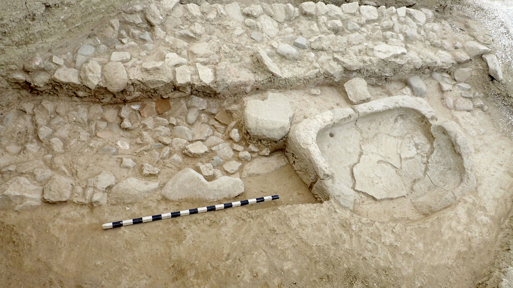 Στην εξωτερική πλευρά του τοίχου 804 υπήρχε λίθινη λεκάνη που πιθανόν να ήταν τοποθετημένη πάνω σε πεζούλι κτισμένο κατά μήκος του τοίχου (863). Η λεκάνη, σε καλή κατάσταση διατήρησης, έχει μήκος 1,20 μ. και πλάτος 1 μ. αλλά κατά την κατολίσθησή της από το πεζούλι αποκολλήθηκε η ανατολική της πλευρά. Μια οπή στο δυτικό της μέρος υποδεικνύει ότι μάλλον χρησιμοποιήθηκε ως λεκάνη νερού ή άλλου υγρού. Το χείλος είναι επιχρισμένο με στρώσεις υδραυλικού κονιάματος και ένα μικρό κανάλι στα βόρεια, βάθους περίπου 11 εκ., πιθανόν να είχε σχέση με αποχέτευση όπως και με άλλο πέτρινο κανάλι που βρέθηκε το 2019 και ανήκε στην παλιότερη φάση. Στα νοτιοανατολικά του τοίχου 804 βρέθηκαν πέτρινο εκμαγείο και θραύσματα πίθου με διακόσμηση από παράλληλες ταινίες. Βρέθηκαν επίσης όστρακα Λευκόχριστης κεραμικής ΙΙ, πρόχους ακόσμητης κεραμικής, μαγειρικά σκεύη και μερικά όστρακα σκούρας χειροποίητης και στιλβωμένης κεραμικής. Ένα μικρό κοίλωμα (13×63 εκ., βάθους 12 εκ.) κοντά στον τοίχο 804 με θραύσματα μαγειρικού σκεύους, ένα κουκούτσι ελιάς, δόντια μεγάλου ζώου και άλλα οργανικά υλικά που έχουν περισυλλεχθεί για ανάλυση, όπως και σκουριά επιβεβαιώνουν τη φύση των εργασιών στο χώρο. Βόρεια του τοίχου υπήρχε μεγάλη συσσώρευση λίθων, ίσως από κάποια κατάρρευση.