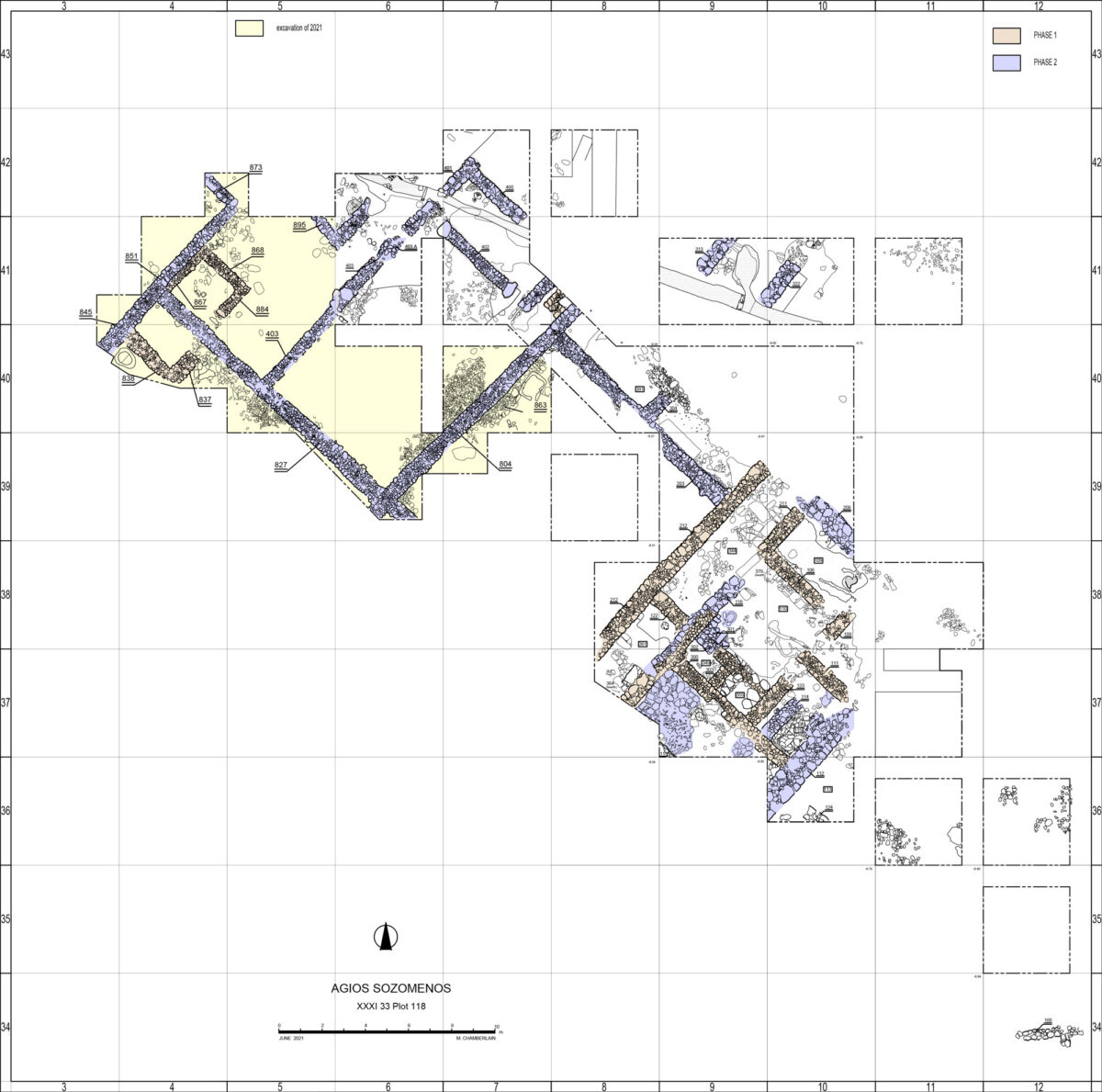 Ο τοίχος 845 κτίστηκε πάνω από παλαιότερο τοίχο και ανήκει στη δεύτερη φάση. Είναι καμωμένος από μεγάλες ακανόνιστες πέτρες στις άκρες και γέμισμα από μικρότερες πέτρες στο εσωτερικό, σε αντίθεση με τους τοίχους της παλιότερης φάσης που είναι κτισμένοι με προσοχή από ομοιόμορφες μικρές πέτρες και είναι στενότεροι. Δύο τοίχοι (895 και 802) φαίνεται να σχηματίζουν ένα ακόμα δωμάτιο, αλλά επειδή δεν δένουν μεταξύ τους μάλλον έχουμε και εδώ το ίδιο φαινόμενο, της χρήσης δηλαδή παλιότερου τοίχου για την κατασκευή της νεότερης φάσης.
