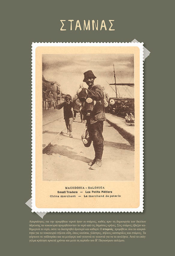«Στα λαϊκά επαγγέλματα του πρώτου μισού του 19ου αιώνα στη Θεσσαλονίκη θα μπορούσαμε να εντάξουμε τα χειρωνακτικά: τους εργάτες οικοδομών, υπηρέτες, νερουλάδες, βαρελοποιούς πηγαδάδες, αγωγιάτες, αχθοφόρους, αμαξάδες, ιπποκόμους (κυρίως σλαβικής καταγωγής) και κτίστες», αναφέρει ο επιμελητής της έκθεσης Νίκος Μαραντζίδης, ο οποίος κατηγοριοποιεί τα επαγγέλματα ανάλογα και με τις εθνότητες.