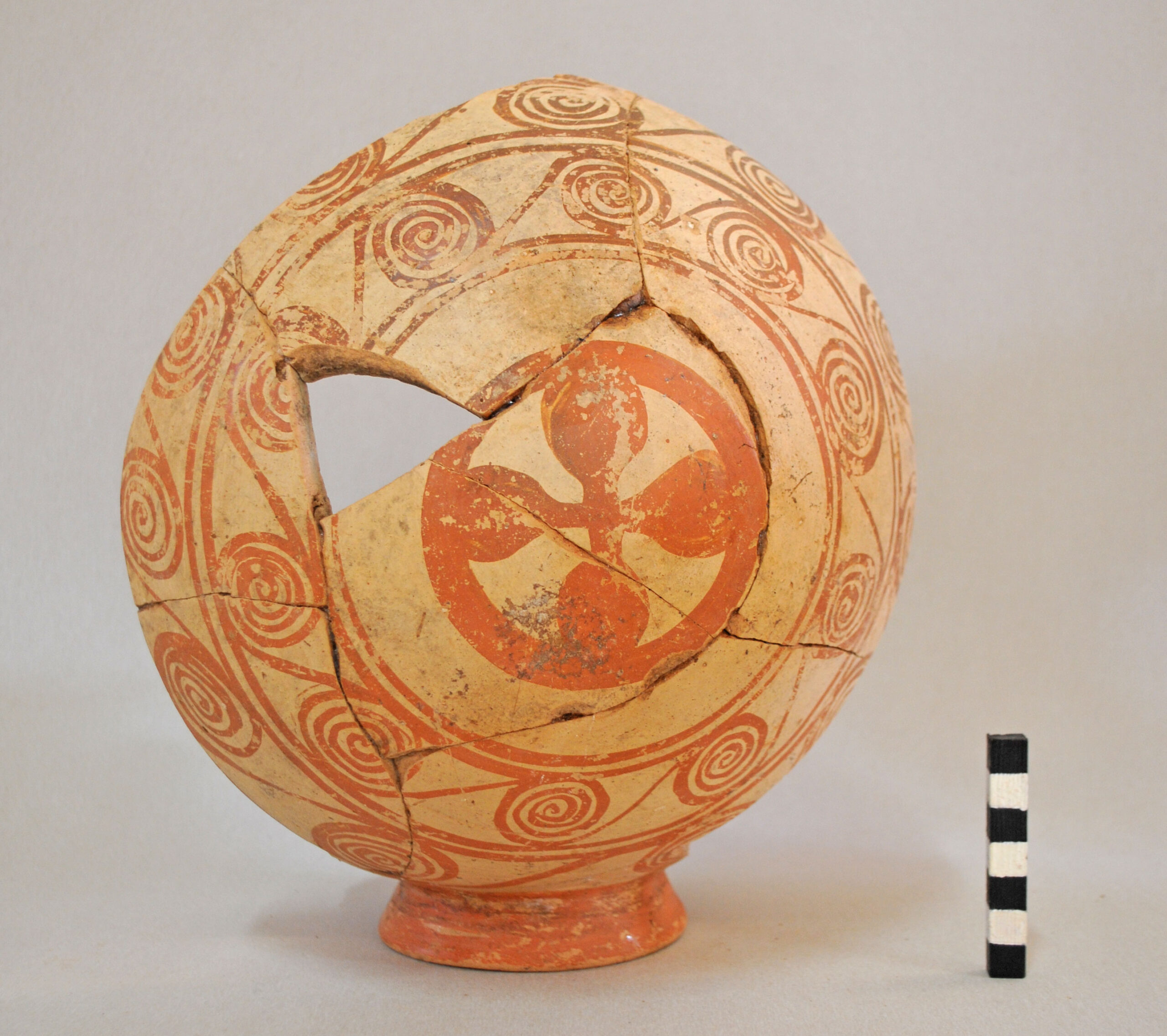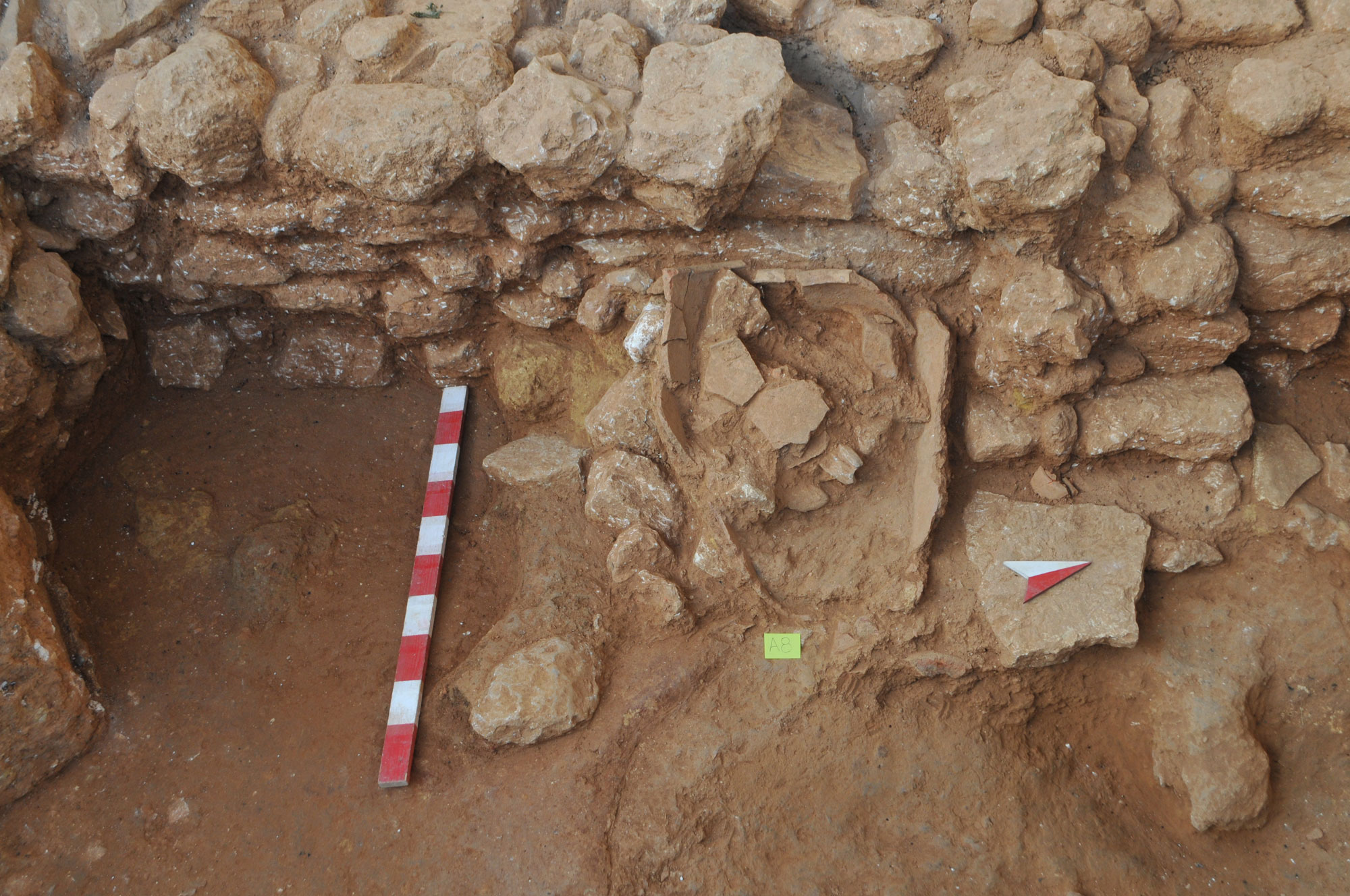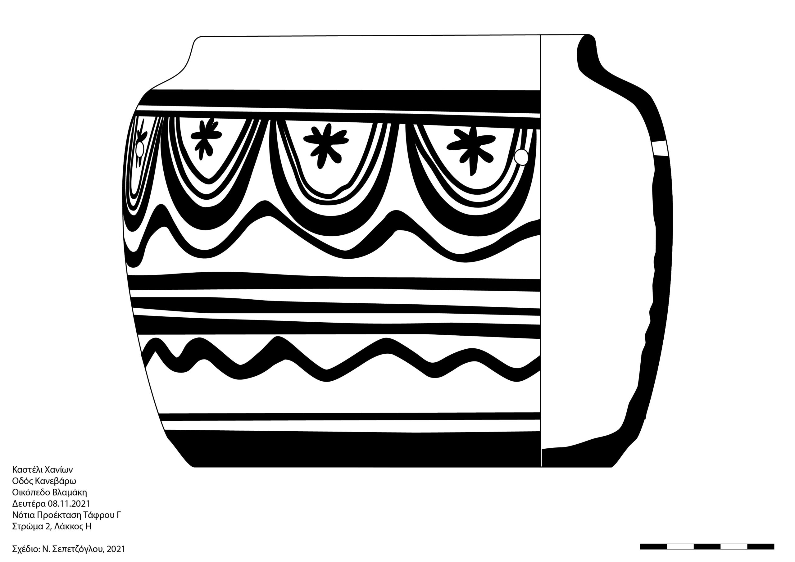Στο δεύτερο σημείο της φετινής ανασκαφικής περιόδου, στο «οικόπεδο Λιονάκη-Βλαμάκη», η έρευνα επεκτάθηκε προς τα βόρεια του ανασκαμμένου κατά το παρελθόν χώρου. Ήρθε στο φως τμήμα οικοδομήματος των χρόνων της ίδρυσης των πρώτων μινωικών ανακτόρων, στις αρχές της 2ης χιλιετίας π.Χ. (εικ. 7-8 και 11). Χαρακτηριστικό εύρημα υπήρξε πίθος τοποθετημένος μπροστά στον δυτικό τοίχο ενός δωματίου (εικ. 9-10). Το συγκεκριμένο δωμάτιο φαίνεται ότι ήταν υπό επισκευή κατά τη στιγμή της καταστροφής του, όπως δηλώνουν συγκεντρωμένα οικοδομικά υλικά σε διάφορα σημεία του δωματίου. Στην άλλη πλευρά του διαχωριστικού τοίχου, στα βορειοδυτικά, αναπτύσσεται δεύτερος χώρος με ισχυρό και πολύ παχύ δάπεδο από ερυθρά και λευκή άργιλο και σε αρκετά υψηλότερο επίπεδο λόγω της κλίσης του λόφου (εικ 12). Ο διαχωριστικός τοίχος έχει εμφανή ίχνη διατάραξης από σεισμό. Τμήμα του δωματίου με τον πίθο είχε διαταραχτεί από μεγάλο αποθέτη των αρχών της ίδρυσης του μυκηναϊκού ανακτόρου της Κυδωνίας (πριν από τα μέσα του 14ου αι. π.Χ.) (εικ. 13). Ο αποθέτης έδωσε πλούσια κεραμική αποτελούμενη κυρίως από σπασμένα, γραπτά, πολυτελή αγγεία αλλά και κύλικες και διάφορα άλλα αγγεία πόσεως, πολλά από τα οποία έφεραν ίχνη φωτιάς μετά το σπάσιμο (εικ. 14-20). Ανάμεσά τους ξεχωρίζει τμήμα γραπτής τράπεζας προσφορών (εικ. 21). Ασφαλώς ανήκουν στην οικοσκευή ενός πλούσιου και σημαντικού οικοδομήματος, σε μια περίοδο κατά την οποία η Κυδωνία άρχισε να πρωτοστατεί στο νησί. Αν τα πρόσφατα ευρήματα συνδυαστούν με την ανεύρεση αρκετών πήλινων ειδωλίων σε παρόμοιους λάκκους κατά την παλαιότερη έρευνα στον χώρο, οδηγούμαστε στην υπόθεση της προέλευσης όλου αυτού του θαυμαστού υλικού από κτήριο σχετιζόμενο με τελετουργίες.
