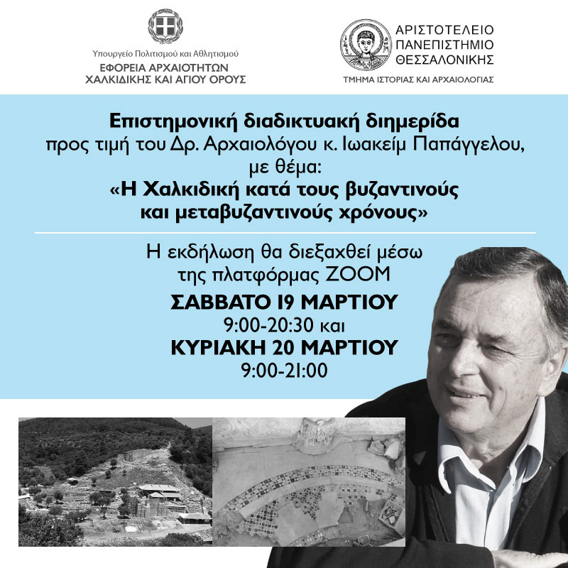 Η Εφορεία Αρχαιοτήτων Χαλκιδικής και Αγίου Όρους σε συνεργασία με το Τμήμα Ιστορίας και Αρχαιολογίας του Αριστοτελείου Πανεπιστημίου Θεσσαλονίκης, τιμώντας την προσφορά και το έργο του αρχαιολόγου Ιωακείμ Παπάγγελου, διοργανώνουν διαδικτυακή επιστημονική διημερίδα με θέμα «Η Χαλκιδική στους βυζαντινούς και μεταβυζαντινούς χρόνους».