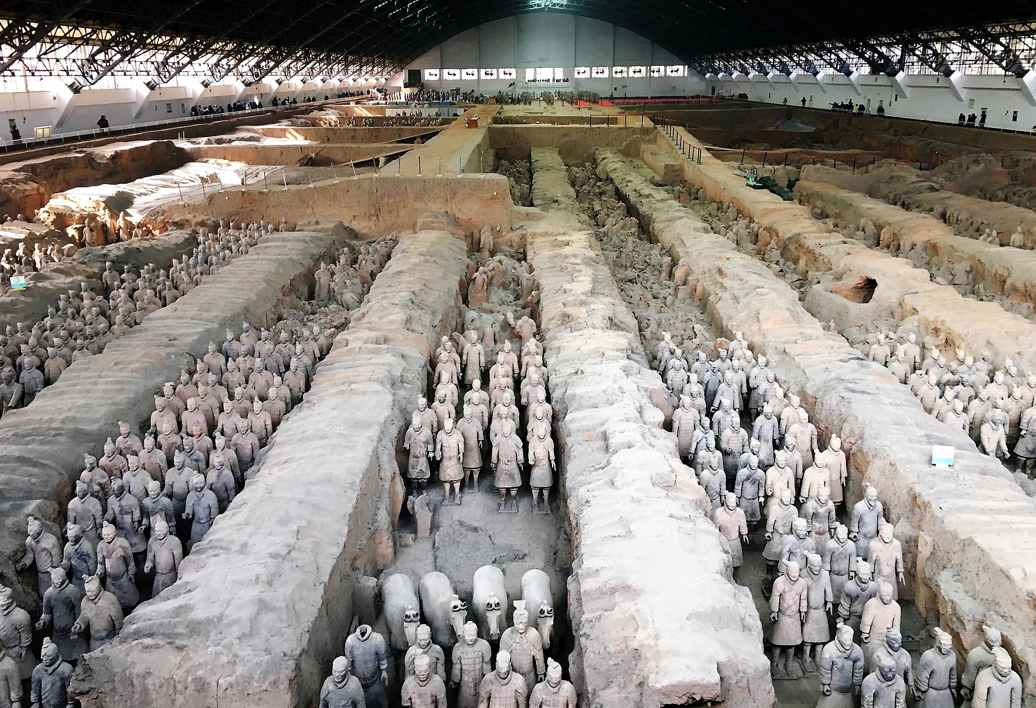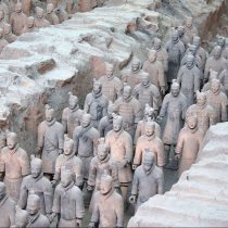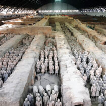Η ανασκαφή που στήνεται θα αποκαλύψει ότι το κεφάλι ανήκει σε ομοίωμα στρατιώτη και μάλιστα σε φυσικό μέγεθος. Καθώς ο χρόνος περνάει και η αρχαιολογική έρευνα εξελίσσεται στα επτά μέτρα κάτω από την επιφάνεια του εδάφους και σε εμβαδόν διαρκώς αυξανόμενο, τα αγάλματα δεν έχουν τελειωμό! Στα έκπληκτα μάτια των αρχαιολόγων αποκαλύπτονται ο ένας μετά τον άλλο πήλινοι στρατιώτες ύψους οι περισσότεροι 1.80 μ. και κάποιοι, ολίγοι, 1.90 μ. Μελετώντας τα διακριτικά στις στολές που «φορούν» οι πολεμιστές, οι επιστήμονες καταλήγουν ότι ψηλότεροι είναι οι βαθμοφόροι. Τις επόμενες δεκαετίες, μια εκτεταμένη ανασκαφή σε τρεις διαφορετικούς θαλάμους, φέρνει στο φως δεκάδες χιλιάδες άρματα και χάλκινα όπλα, εκατοντάδες ομοιώματα αλόγων επίσης σε φυσικό μέγεθος και 8.000 πήλινους στρατιώτες. Σε εντυπωσιακά καλή κατάσταση είναι κάτι παραπάνω από 5.000. Οι υπόλοιποι είναι θρυμματισμένοι. Θα ήταν θαύμα να μην άφηναν τα σημάδια τους οι δύο χιλιετίες που πέρασαν… Γιατί εκεί χρονολογούνται τα ευρήματα. Στον 3ο αι. π.Χ. Για την ακρίβεια, τοποθετούνται ανάμεσα στο 246 και το 208 π.Χ. Αν και οι ιστορικοί μελετητές λένε ότι οι θρυμματισμένοι πήλινοι στρατιώτες, δεν διαλύθηκαν από τον χρόνο, αλλά από αντίπαλες δυναστείες, που επέδραμαν στο μαυσωλείο του αυτοκράτορα και κατέστρεψαν ό,τι πρόλαβαν, πριν το σκεπάσουν οι αιώνες…