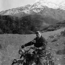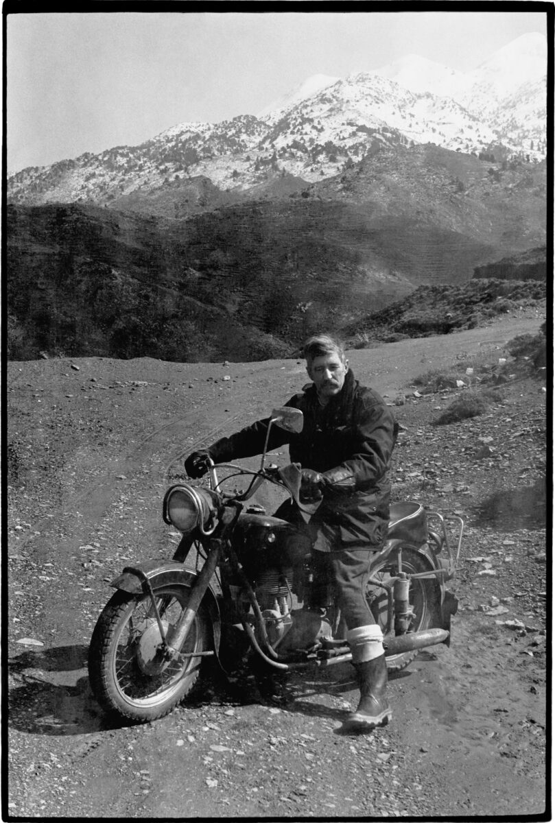 Στη φωτογραφία του Τζον Κράξτον, μοτοσυκλετιστή, με φόντο τα Λευκά Όρη τίποτε δεν μαρτυρεί ότι πρόκειται για Βρετανό ζωγράφο και μάλιστα από τους σημαντικούς. Μουστάκι παχύ, γαλότσες, δυνατό βλέμμα, ακόμα κι η ντοπιολαλιά του ήταν κρητική λένε όσοι τον γνώρισαν. Δίπλα στη φωτογραφία μια κάρτα που είχε στείλει το 1954 από την Αγγλία στον φίλο του, Ντίνο Μαστροπέτρο, στον Πόρο. «Είμαι πολύ στενοχωρημένος. Η Αγγλία είναι φρίκη. Όλο ομίχλη, συννεφιά, βροχή. Θα πεθάνω τρεις μήνες χωρίς ήλιο» τού ομολογεί.