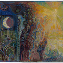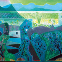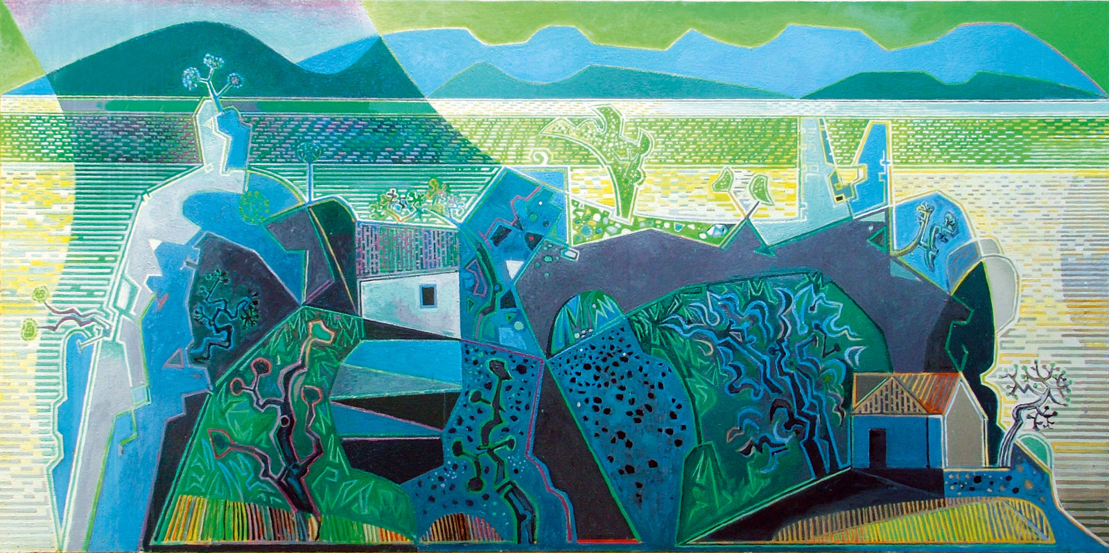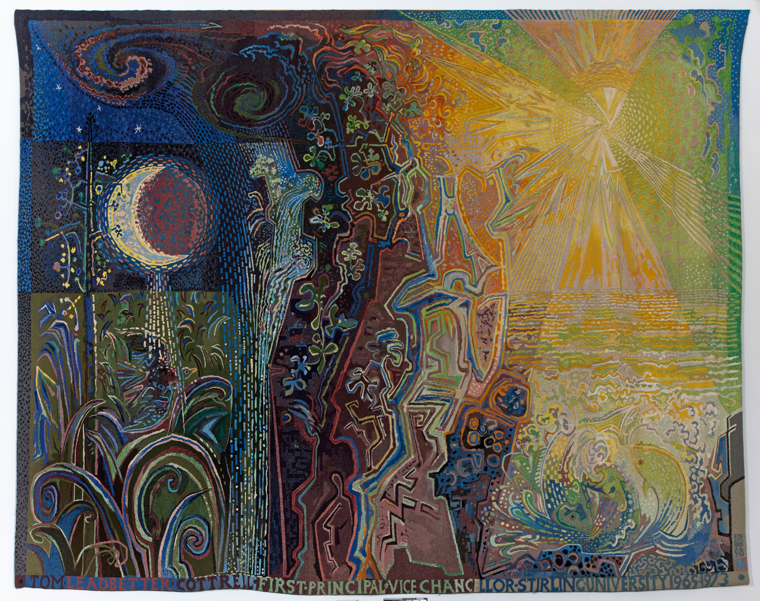 Κατά τα σχεδόν δέκα ανήσυχα χρόνια της εξορίας του ταξίδεψε στο Εδιμβούργο –«την Αθήνα του Βορρά»– προκειμένου να σχεδιάσει και να επιβλέψει τη δημιουργία μιας ταπισερί που απέτινε φόρο τιμής στην παραδοσιακή κρητική υφαντουργία και στη μυθολογία, το κλίμα, τα τοπία και τον αισθησιασμό της Ελλάδας. Η ταπισερί Τοπίο με στοιχεία της φύσης θα ταξιδέψει για πρώτη φορά από τη Σκωτία στην Ελλάδα και θα αποτελέσει το κεντρικό έκθεμα της έκθεσης.