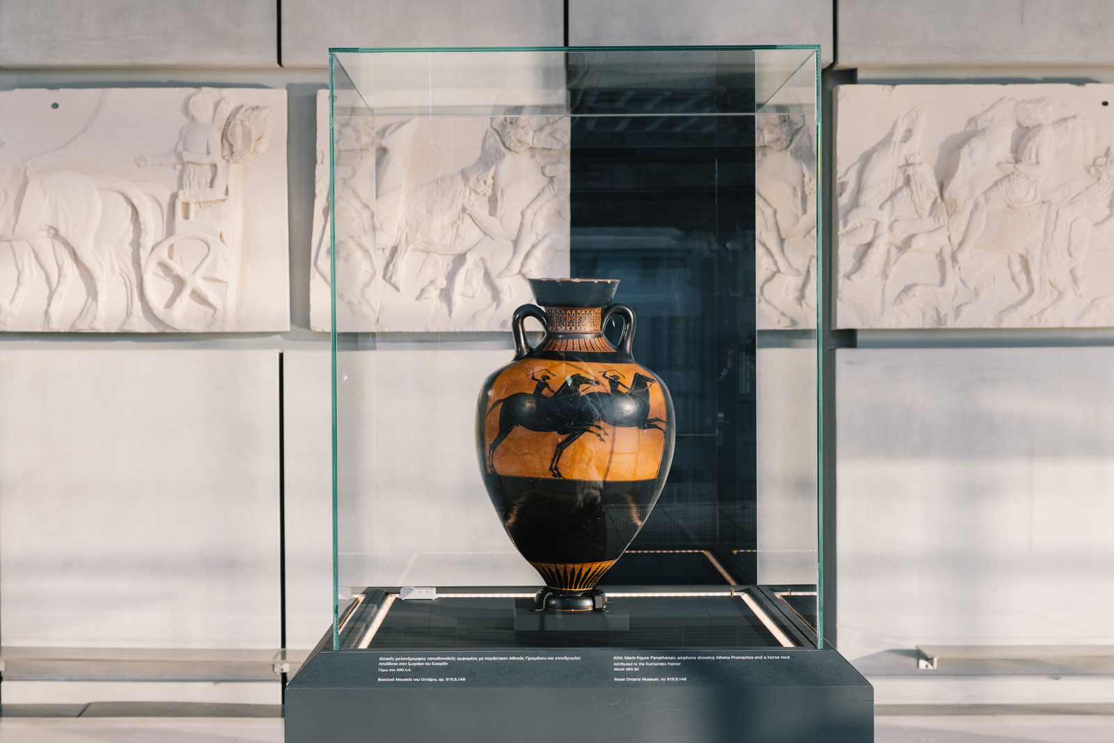 Η εκδήλωση συνδυάστηκε με τα εγκαίνια της νέας εκθεσιακής δράσης «Των Αθήνηθεν άθλων. Παναθηναϊκοί αμφορείς από το Τορόντο του Καναδά στη γενέθλια γη», όπου δύο εξαιρετικής τέχνης αγγεία από το Βασιλικό Μουσείο του Οντάριο θα εκτίθενται, έως τις 8 Ιανουαρίου 2023, στην αίθουσα του Παρθενώνα, σε συνδιαλλαγή με τη ζωφόρο του Παρθενώνα, στην οποία ο Φειδίας και οι συνεργάτες του λάξευσαν αριστουργηματικά την πομπή της γιορτής των Παναθηναίων. Πρόκειται για μία πολιτιστική συνεργασία με το καναδικό μουσείο, στο οποίο από τον Μάρτιο του 2022 παρουσιάζεται η Κόρη της Ακρόπολης 670.