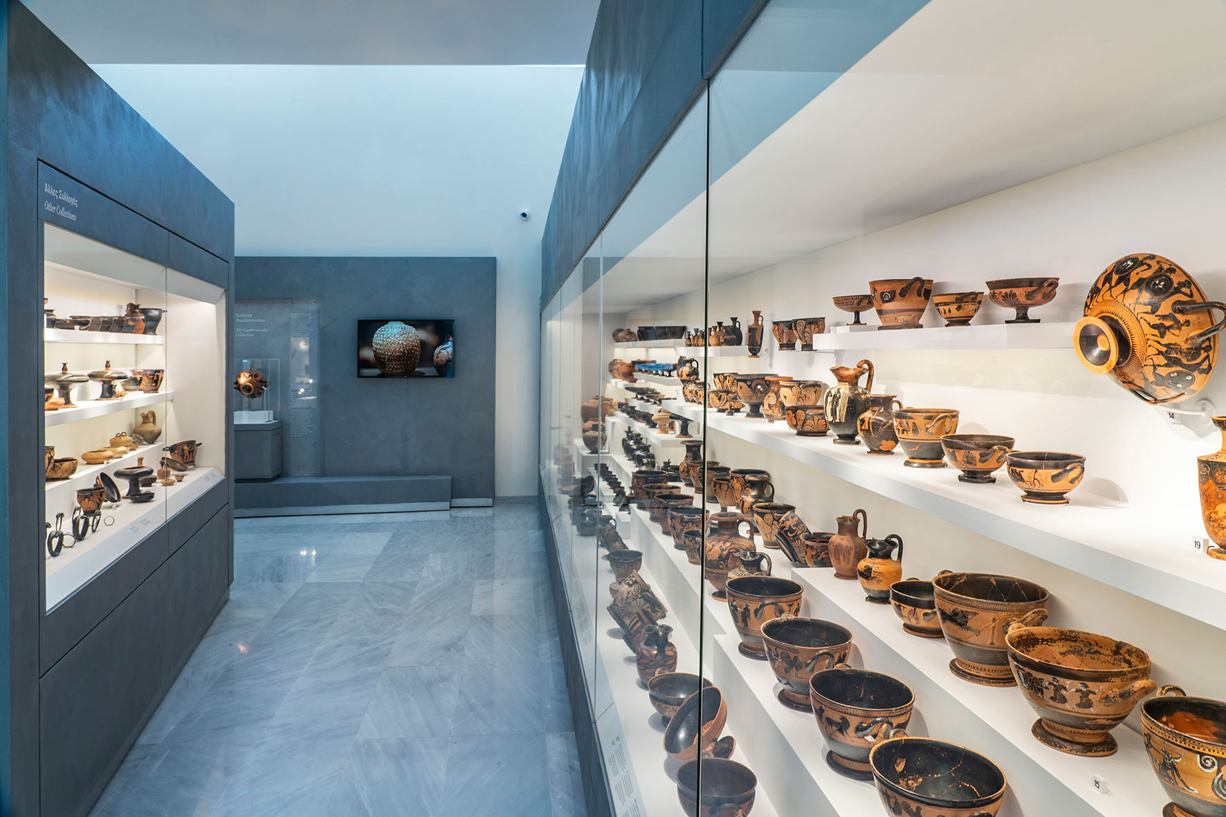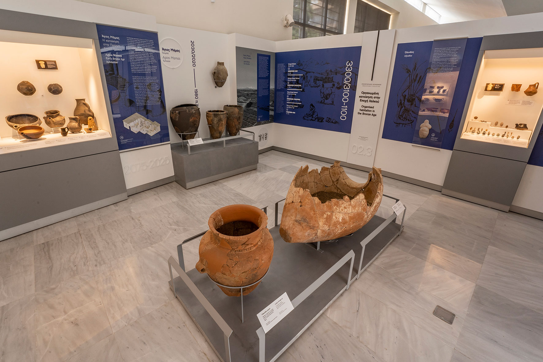 Η έκθεση του νέου μουσείου αναπτύσσεται σε τέσσερις θεματικές ενότητες: «Τόπος και Ιστορία», «Προϊστορικές κοινωνίες», «Ιστορικοί χρόνοι», «Συλλογές και Δωρεές». Παρουσιάζονται ευρήματα από τους πιο σημαντικούς προϊστορικούς οικισμούς και νεκροταφεία της Χαλκιδικής, τον Άγιο Μάμα, την Όλυνθο και την Τορώνη, το Κριαρίτσι και τη Νέα Σκιώνη, ενώ επιλεγμένα εκθέματα των ρωμαϊκών χρόνων, επιτύμβια αγάλματα και στήλες, προετοιμάζουν τον επισκέπτη πριν από την ολοκλήρωση της ενότητας «Ιστορικοί Χρόνοι». Στην αίθουσα που εκτίθενται οι Συλλογές, κυρίαρχη θέση καταλαμβάνει η αξιόλογη Συλλογή Λαμπρόπουλου.
