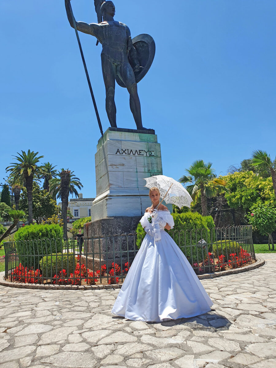 Στέκεται μπροστά στο κολοσσιαίο άγαλμα του ημίθεου Αχιλλέα και χαμογελά σε όλους εκείνους που έρχονται να το θαυμάσουν, ενώ κλέβει όλα τα βλέμματα, τους παρασύρει και την ακολουθούν και στο άγαλμα του «Θνήσκοντος Αχιλλέα». Η μελωδία που ακούγεται από το πιάνο και το βιολί ακολουθεί πιστά κάθε βήμα της. Όταν την πλησιάσεις καταλαβαίνεις ότι πρόκειται για ένα πανέμορφο μοντέλο που έχει όλη τη χάρη της πριγκίπισσας Σίσσυ και έχει εντρυφήσει τόσο καλά στον ρόλο της που αισθάνεται και η ίδια πριγκίπισσα.