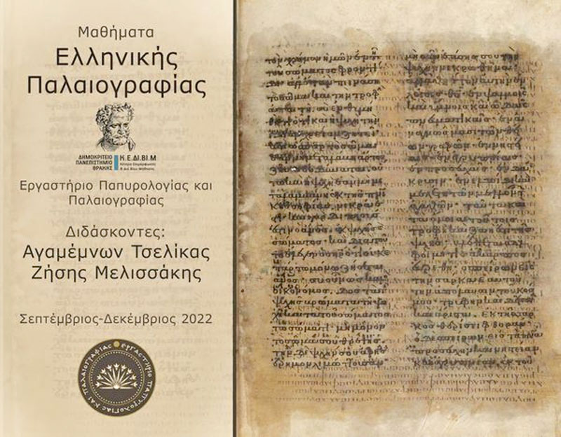 Το Κέντρο Επιμόρφωσης και Διά Βίου Μάθησης του Δημοκρίτειου Πανεπιστημίου Θράκης διοργανώνει επιμορφωτικό πρόγραμμα με τίτλο «Μαθήματα Ελληνικής Παλαιογραφίας» από τις 14 Σεπτεμβρίου 2022 έως τις 31 Δεκεμβρίου 2022 με επιστημονικά υπεύθυνο τον Σταμάτη Μπουσέ, Αναπληρωτή Καθηγητή Αρχαίας Ελληνικής Φιλολογίας–Παπυρολογίας.