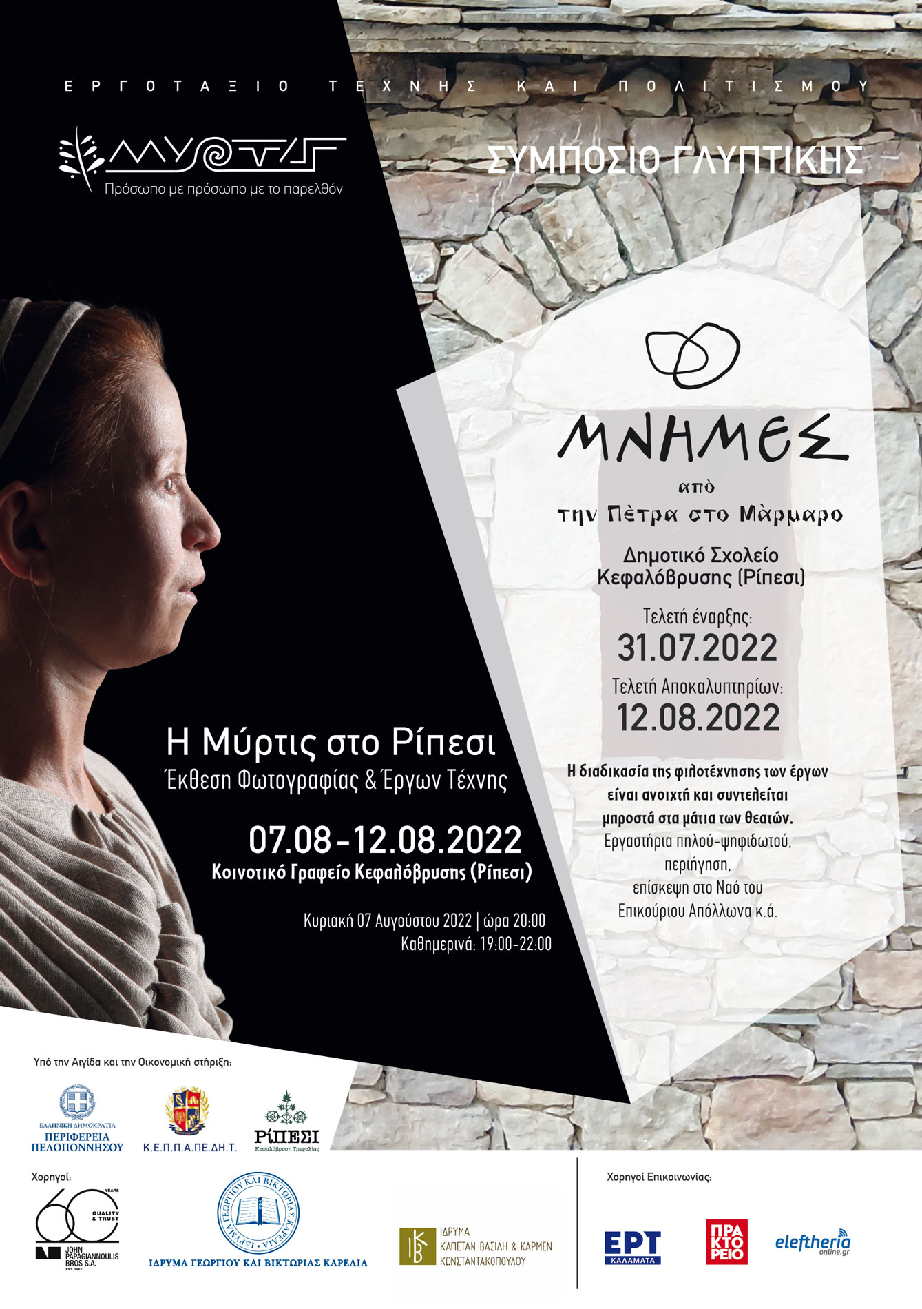 Η Κοινότητα Κεφαλόβρυσης (Ρίπεσι) του Δήμου Τριφυλίας, ο Σύλλογος Αποδήμων Κεφαλοβρυσητών και οι Φίλοι και Εθελοντές της Κοινότητας Κεφαλόβρυσης συνδιοργανώνουν στο Ρίπεσι το Συμπόσιο γλυπτικής «Μνήμες από την Πέτρα στο Μάρμαρο» και την έκθεση Φωτογραφιών και Έργων Τέχνης «Μύρτις: Πρόσωπο με Πρόσωπο με το παρελθόν», από την Κυριακή 31 Ιουλίου έως την Παρασκευή 12 Αυγούστου 2022. Οι εκδηλώσεις τελούν υπό την αιγίδα του υπουργείου Πολιτισμού και Αθλητισμού και την οικονομική στήριξη της Περιφέρειας Πελοποννήσου και της ΚΕΠΠΑΠΕΔΗΤ, της Κοινωφελούς Επιχείρησης του Δήμου Τριφυλίας.