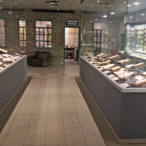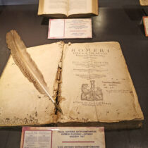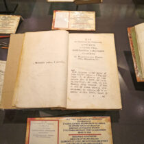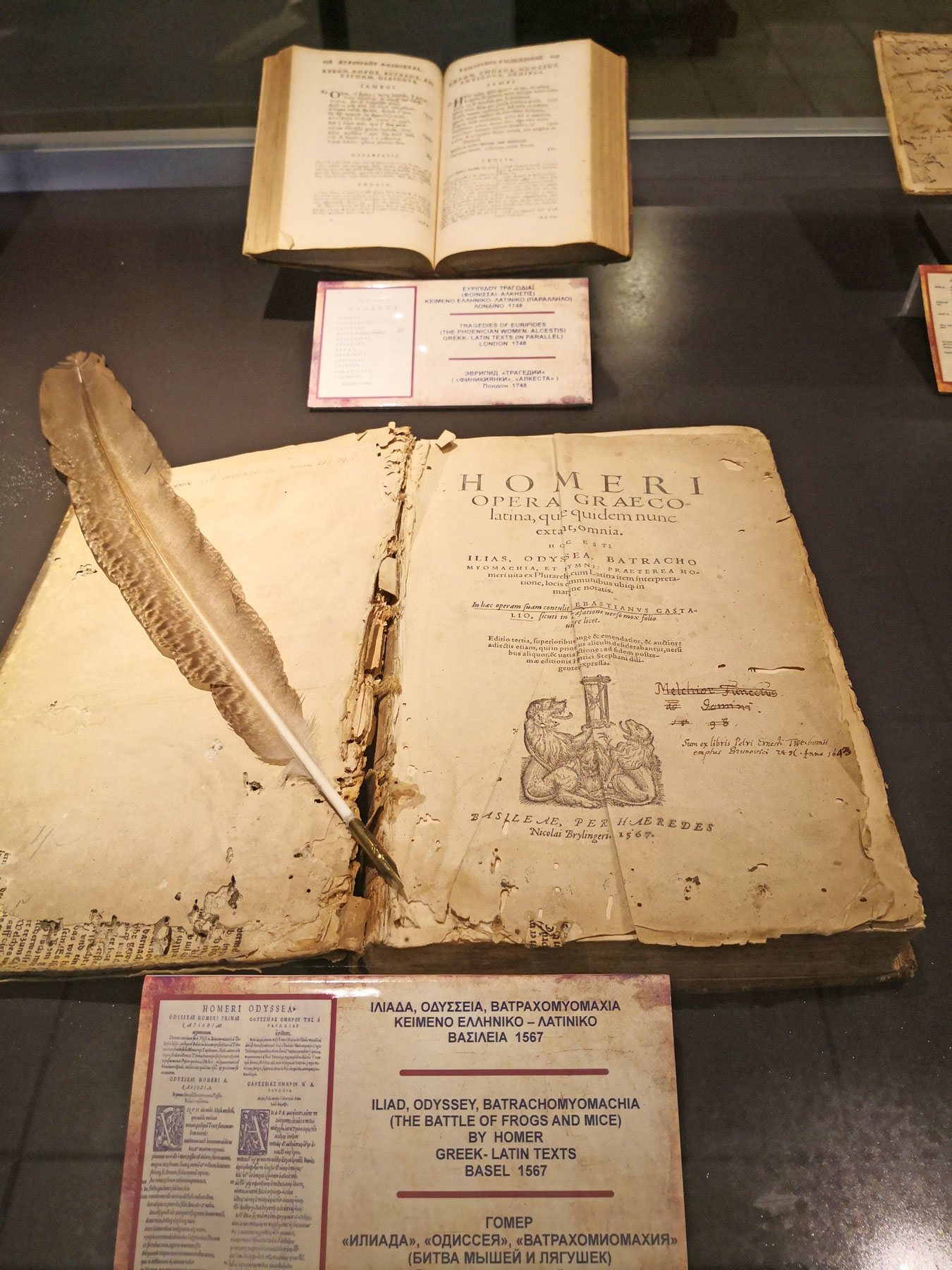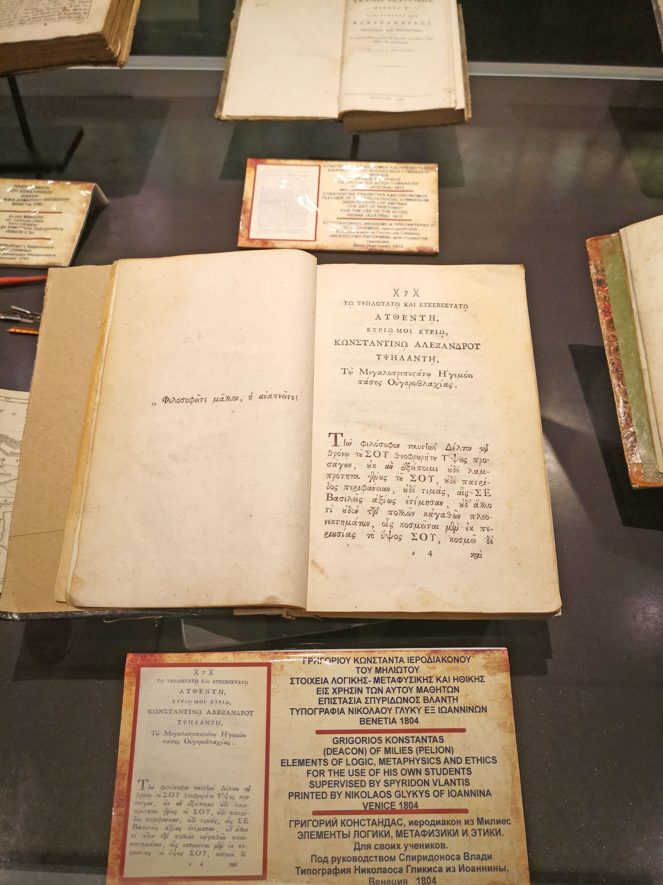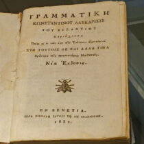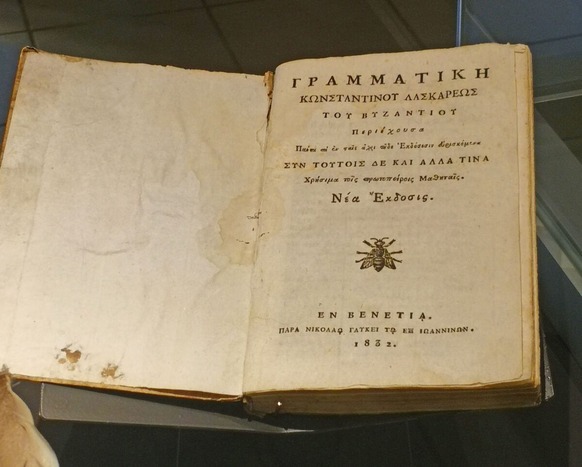 Στις προθήκες του ξεχωρίζει το πρώτο βιβλίο που τυπώθηκε με ελληνικό κείμενο, η Γραμματική του Κωνσταντίνου Λασκάρεως του Βυζαντίου. Δύο εκδόσεις του βιβλίου αυτού έγιναν στη Βενετία, η πρώτη από το τυπογραφείο του Πάνου Θεοδοσίου και η άλλη από το τυπογραφείο του Νικολάου Γλυκύ.