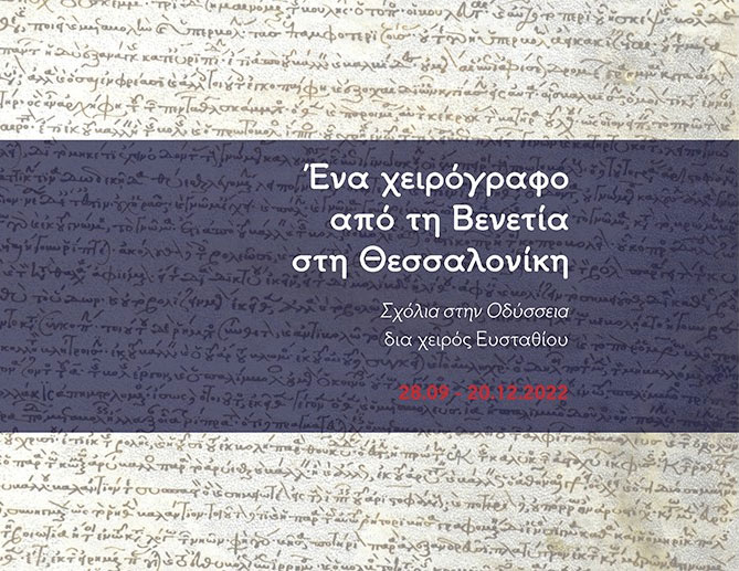«Ένα χειρόγραφο από τη Βενετία στη Θεσσαλονίκη. Σχόλια στην Οδύσσεια δια χειρός Ευσταθίου» είναι ο τίτλος της νέας περιοδικής έκθεσης που εγκαινιάζεται την Τετάρτη 28 Σεπτεμβρίου 2022, στις 19:00, στο Αρχαιολογικό Μουσείο Θεσσαλονίκης.