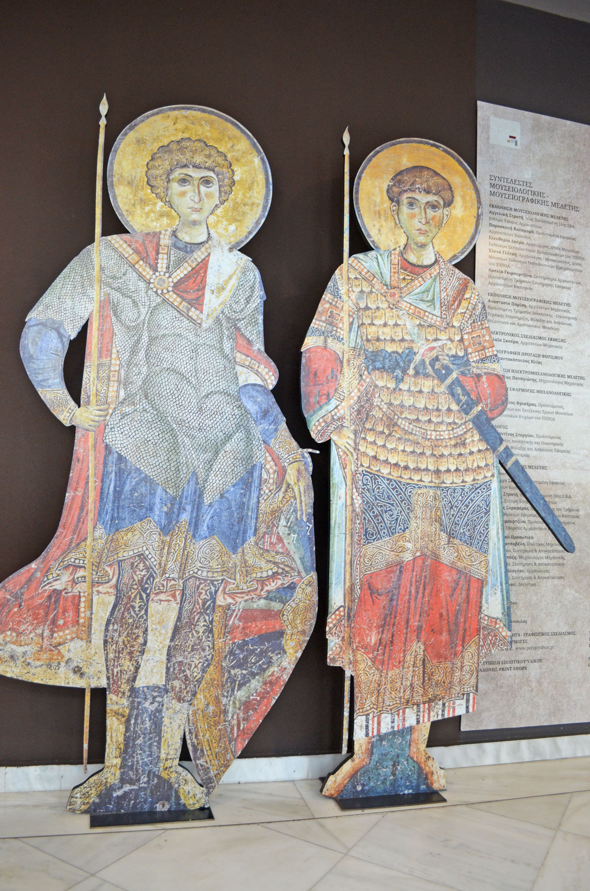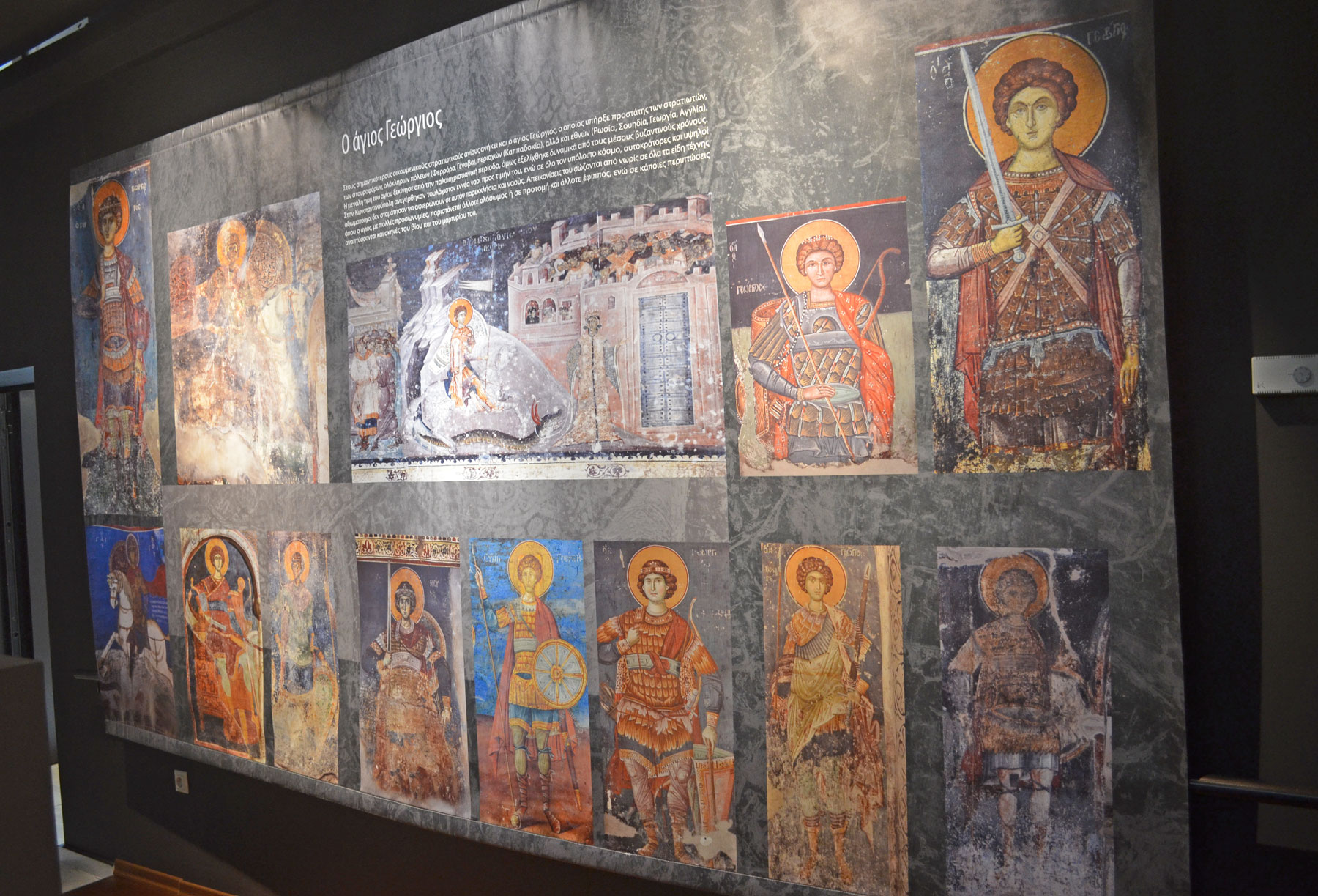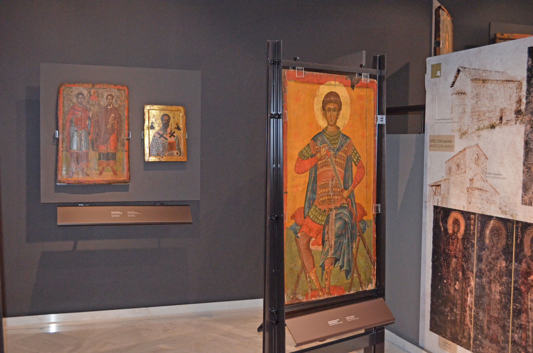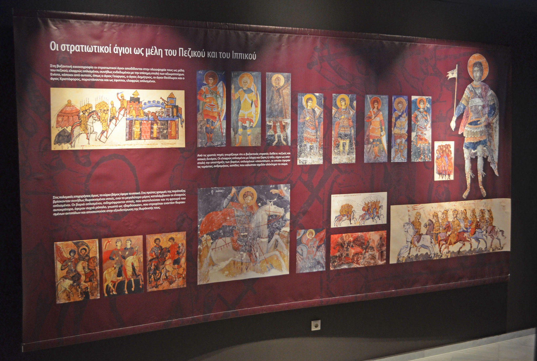 Στην έκθεση μπορεί κανείς να δει τις πρωτότυπες παραστάσεις του Αγ. Γεωργίου (12ος αι.), του Αγ. Δημητρίου (14ος αι.), του Αγ. Θεοδώρου (15ος αι.) και βέβαια του Αγ. Μηνά (15ος αι.), που προέρχονται από τους βυζαντινούς ναούς της Καστοριάς καθώς και αντίγραφα άλλων στρατιωτικών αγίων, που προέρχονται είτε πάλι από τους βυζαντινούς ναούς της ακριτικής πόλης, είτε από τη Βέροια και τη Θεσσαλονίκη.