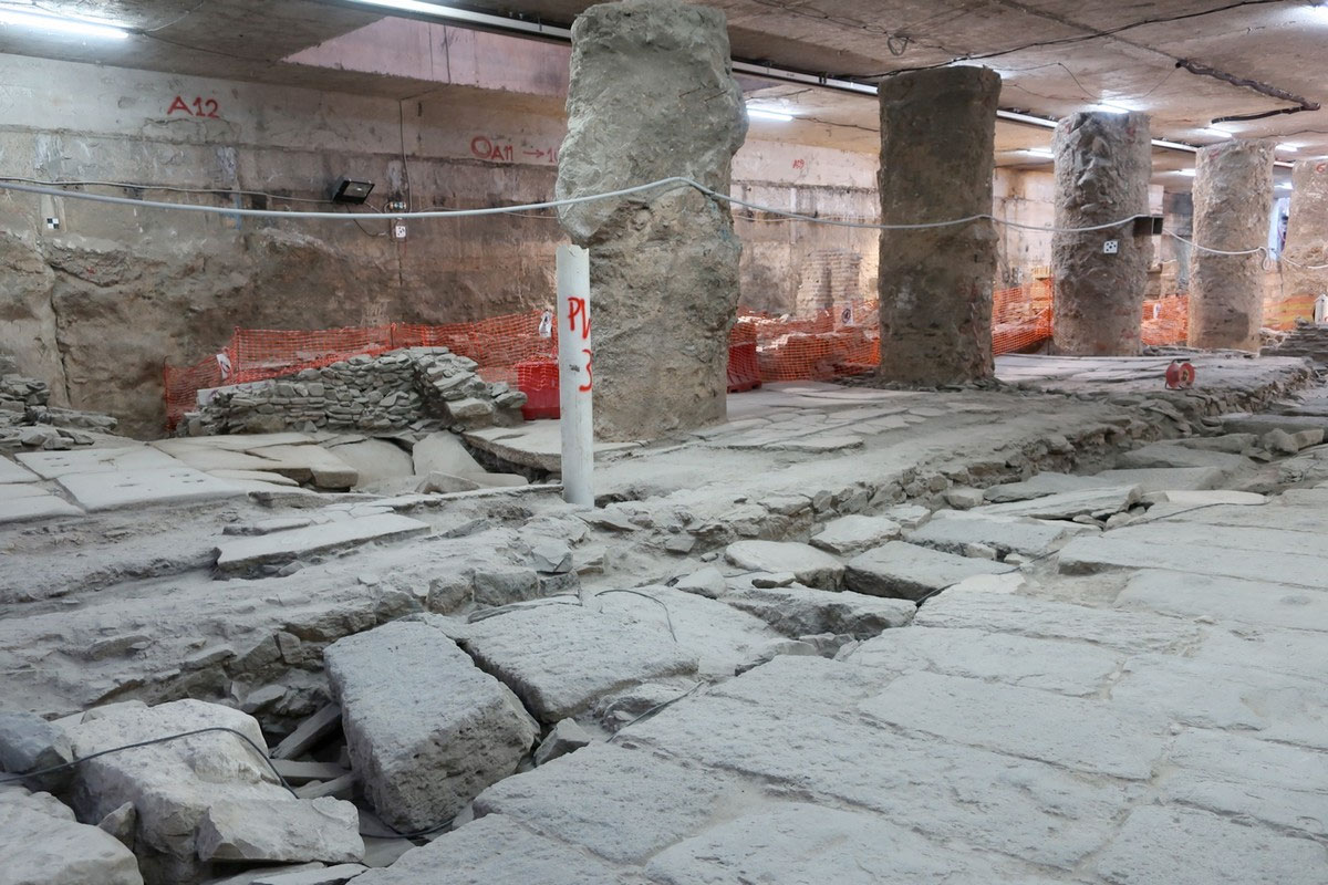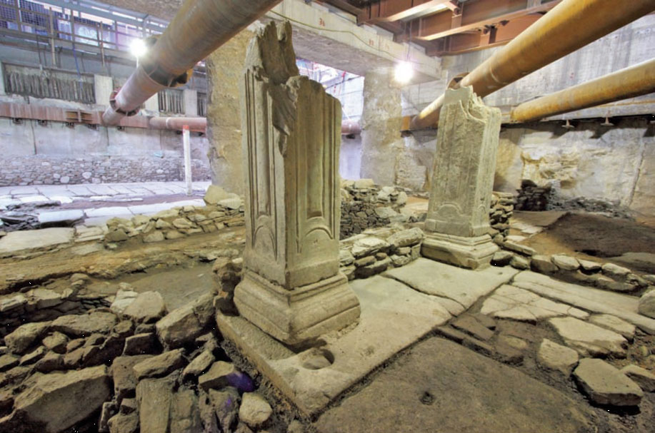 Κατά την α’ φάση της ανασκαφικής διερεύνησης αποκαλύφθηκε με εντυπωσιακή πληρότητα τμήμα της κοσμικής πόλης της Ύστερης Αρχαιότητας και των βυζαντινών χρόνων. Πρόκειται για τη διασταύρωση του decumanus maximus και του cardo (οδός Βενιζέλου), 6 μ. περίπου χαμηλότερα από τη σημερινή κομβική διασταύρωση. Η σημασία και η μοναδικότητα του ευρήματος ως συνόλου, δηλαδή ως αναπεπταμένου τμήματος του πολεοδομικού ιστού της βυζαντινής Θεσσαλονίκης, αναγνωρίστηκε ήδη από το 2013, όταν τέθηκε για πρώτη φορά στο Κεντρικό Αρχαιολογικό Συμβούλιο το θέμα της κατασκευής του Σταθμού, με απόσπαση των αρχαιολογικών καταλοίπων και μεταφορά τους για έκθεση σε άλλη θέση. Ο σχεδιασμός άλλαξε το 2017, αν και το 2016 το ΣτΕ είχε αποφασίσει για τη νομιμότητα των υπουργικών αποφάσεων της περιόδου 2013-2014, όταν η κυβέρνηση ΣΥΡΙΖΑ αποφάσισε την κατασκευή του σταθμού με την κατά χώρα παραμονή των αρχαιοτήτων. Το γεγονός ότι επί μία πενταετία δεν προχώρησε απολύτως τίποτε μελετητικά αποδεικνύει το ανέφικτο της υλοποίησης του σχεδιασμού της προηγούμενης κυβέρνησης. Το 2019, το Κεντρικό Αρχαιολογικό Συμβούλιο τάχθηκε υπέρ της απόσπασης και επανατοποθέτησης στον Σταθμό Βενιζέλου σταθμίζοντας τη σπουδαιότητα των αρχαιοτήτων σε σχέση με την αναγκαιότητα κατασκευής του εκτελούμενου έργου που υπηρετεί το ευρύτερο δημόσιο συμφέρον. Οι εργασίες απόσπασης των 96 ενοτήτων ξεκίνησαν, σύμφωνα με την εγκεκριμένη μελέτη, στις 13 Αυγούστου 2021.