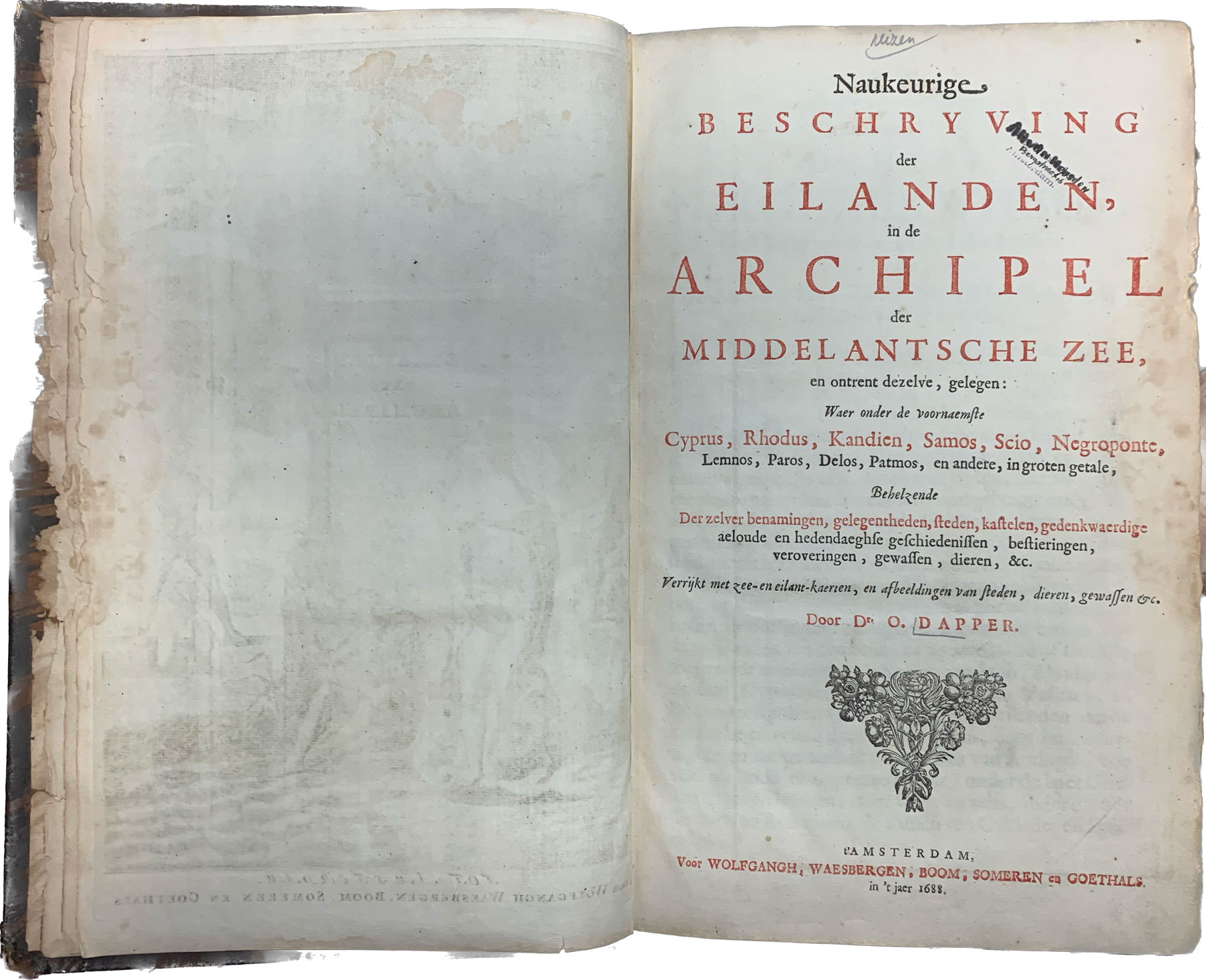 Πρόκειται για την πρώτη έκδοση ενός βιβλίου του 1688, του ερευνητή Ολλανδού ιατρού O. Dapper, ο οποίος έναν χρόνο πριν πεθάνει έγραψε το τελευταίο έργο της συγγραφικής πορείας του, στις σελίδες του οποίου ξεδιπλώνεται σημαντική γνώση για τα νησιά της Μεσογείου, του Αρχιπελάγους όπως αναφέρει ο κ. Τσάκωνας, «… μεταξύ των οποίων η Ρόδος, η Χίος, η Λήμνος, η Κύπρος, η Κρήτη, η Δήλος κ.ά. Στις πλέον καλοδιατηρημένες εννιακόσιες σελίδες του υπέροχου αυτού αποκτήματος, του απίστευτου κοσμήματος, υπάρχουν δεκάδες χάρτες, γκραβούρες, χαλκογραφίες, κείμενα. Εκ των οποίων ενενήντα εννέα αφορούν στην Κρήτη και σημαντικός αριθμός σελίδων προσθέτει στη γνώση μας για το Βενετσιάνικο Ρέθυμνο». Το βιβλίο που βρίσκεται σε άριστη κατάσταση τυπώθηκε στο Άμστερνταμ, έχοντας έναν βενετσιάνικο χάρτη του Ρεθύμνου τον οποίο ο ερευνητής και συγγραφέας αναγνώρισε και «…έτσι ξεκίνησε το ταξίδι ώστε τελικά το Ρέθυμνο να αποκτήσει μέσα από μία δημοπρασία με περίπου 400 παλιά βιβλία, το απίστευτο αυτό στολίδι της Δημοτικής μας Βιβλιοθήκης», λέει στο ΑΠΕ-ΜΠΕ ο κ. Τσάκωνας.