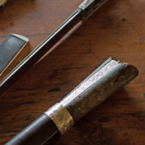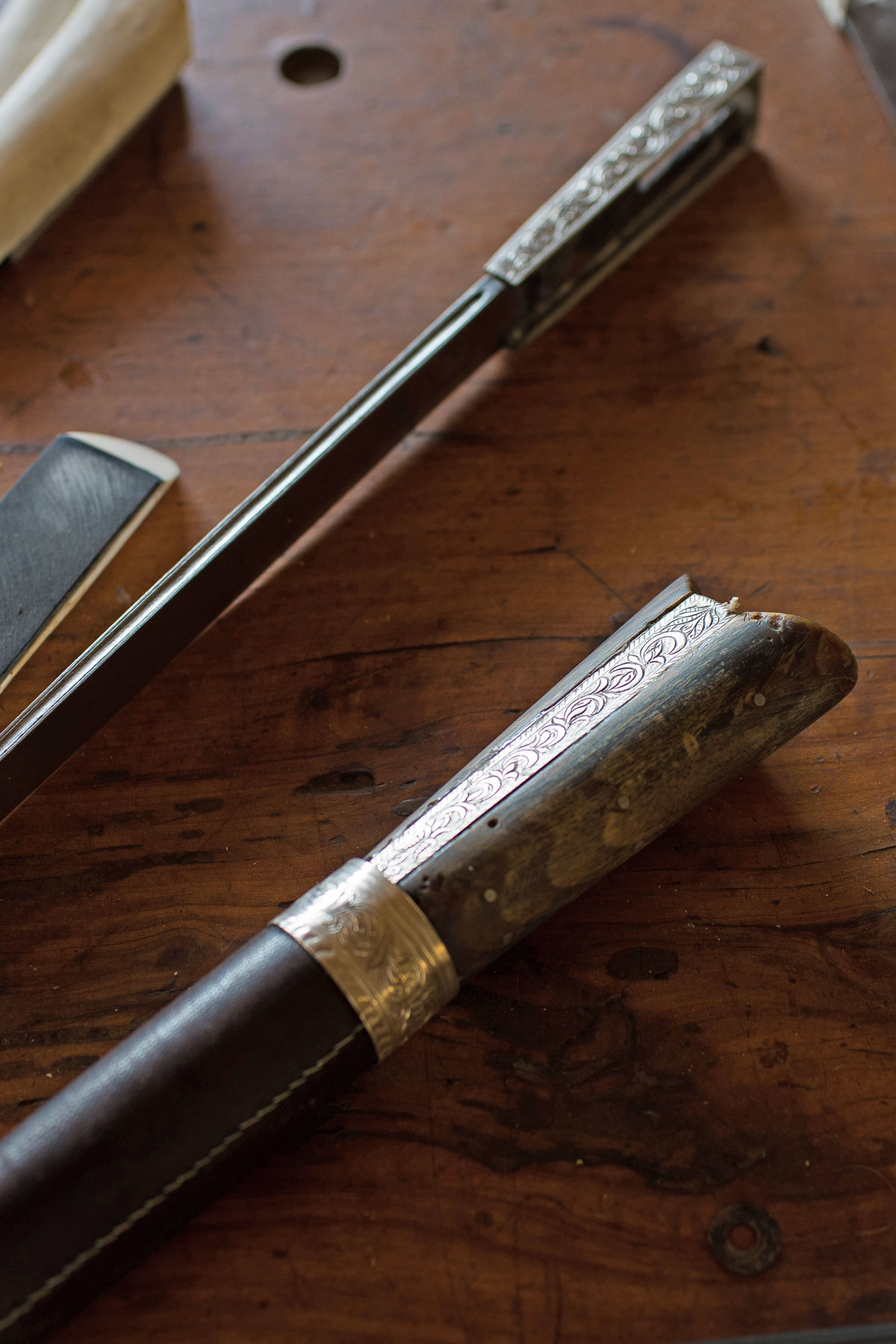 Το κρητικό μαχαίρι, λαβή και λάμα, αναπαύεται όπως εξηγεί ο κ. Πατεράκης, στο θηκάρι ή αλλιώς φουκάρι, στην είσοδο του οποίου υπάρχει ο κύλινδρος για να μπορέσουν με ασφάλεια να κλειδώσουν οι χαψέδες του κρητικού μαχαιριού. Περίπου στη μέση της θήκης, οι τεχνίτες δημιουργούν το κερκέλι, που είναι μία αλυσίδα ασημένια πάνω στην οποία ο χρήστης επέλεγε τι θα κρεμάσει, όπως φλουριά, ξόμπλια, αγαπημένα του μικρά αντικείμενα ή νομίσματα. Στην τελείωση του φουκαριού της θήκης, πάντα υπάρχει η ασημένια αναπαράσταση ενός κεφαλιού δράκου, ή φιδιού. Αυτό το τόσο ιδιαίτερο στοιχείο που αφορούσε μέρος της κρητικής φορεσιάς αλλά και της ζωής του Κρητικού ανά τους αιώνες, συντρόφευε κυρίως τους άνδρες τόσο στη βουκολική ζωή τους, στις εργασίες τους, ως εργαλείο όπως και στις μάχες που έδιναν είτε με στοιχεία της φύσης, είτε για την ελευθερία τους και την προστασία της ζωής τους. Δυστυχώς, είναι χιλιάδες τα κρητικά μαχαίρια, τα οποία σε δύσκολους καιρούς οι κάτοχοί τους τα έδιναν για λιώσιμο ώστε να εξοικονομήσουν φαγητό για τις οικογένειές τους με αποτέλεσμα να χαθούν στην πυρά καλλιτεχνικές δημιουργίες που είχαν αποτυπωμένη την ταυτότητα αλλά και την ιστορία της Κρήτης.