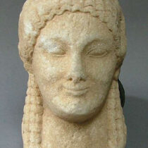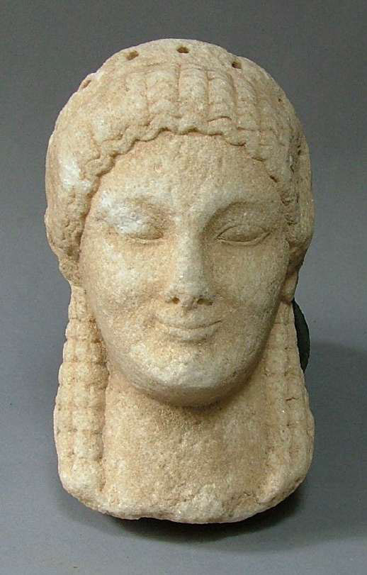 Μαρμάρινη αρχαϊκή κεφαλή κόρης ή σφίγγας. Κυματοειδείς βόστρυχοι πλαισιώνουν το μέτωπο, ενώ αστραγαλωτοί τον λαιμό. Στην κορυφή της κεφαλής οπές για τη στερέωση διαδήματος. 550-500 π.Χ.