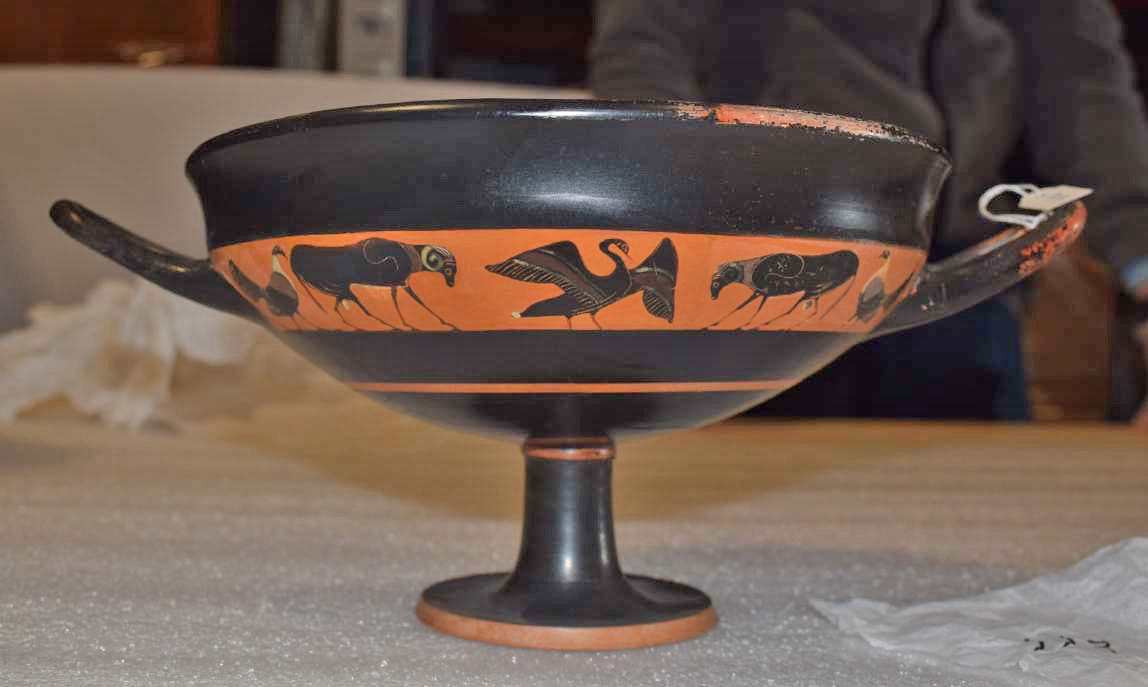 Αττική μελανόμορφη μικρογραφική ταινιωτή κύλικα. Φέρει στην όψη Α πτηνά και κριάρια και στην όψη Β πολεμιστές. 550-540 π.Χ.