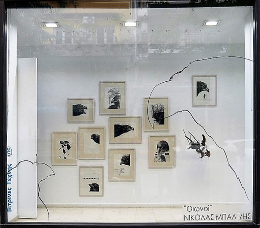 Αετοί, σπουργίτια και κοράκια έχουν… χτίσει φωλιές στο κέντρο της Θεσσαλονίκης. Περαστικοί που διέρχονται από την οδό Καρόλου Ντηλ μπορούν να τα δουν από κοντά και να τα παρατηρήσουν. Πρόκειται για την έκθεση ζωγραφικής και εγκατάσταση με τίτλο «Οιωνοί», του νεαρού καλλιτέχνη Νικόλα Μπαλτζή, που φιλοξενείται εδώ και λίγες μέρες στις Βιτρίνες Τέχνης του ΟΤΕ.