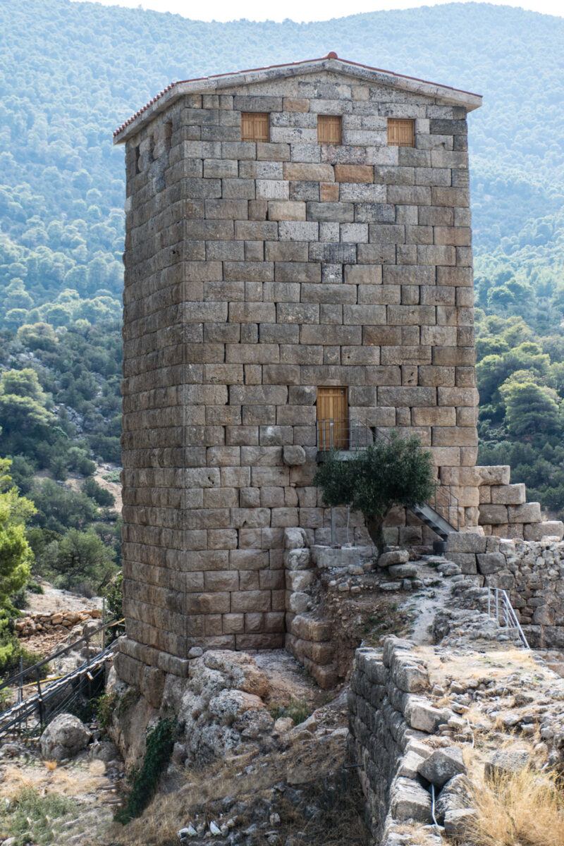 Ο «Περίπατος στο Αρχαίο Φρούριο των Αιγοσθένων» συνδυάστηκε με ξενάγηση από αρχαιολόγους της Εφορείας, η οποία ξεκίνησε από την ακρόπολη του αρχαίου φρουρίου, συνεχίστηκε με επίσκεψη στο εσωτερικό του αναστηλωμένου Νοτιοανατολικού Πύργου –που συγκαταλέγεται στα σπουδαιότερα μνημεία της αρχαίας οχυρωματικής τέχνης– και ολοκληρώθηκε με περιήγηση στην κάτω πόλη που απολήγει στην ακτή. «Το φρούριο κτίστηκε στο β’ μισό του 4ου αι. π.Χ., προσδίδοντας στη θέση οχυρωματικό χαρακτήρα. Την εποχή που κτίστηκε το φρούριο, τα Αιγόσθενα αποτελούσαν μεγαρική κώμη, ανήκαν δηλαδή στην επικράτεια των Μεγαρέων. Τα τείχη του φρουρίου περιέκλειαν την αρχαία πόλη, η οποία αποτελείται από την ακρόπολη κτισμένη σε χαμηλό λόφο, σε απόσταση 450 μ. από την ακτή και την κάτω πόλη που φθάνει μέχρι τη θάλασσα. Τα τείχη ενισχύονταν με πύργους. Σήμερα είναι ορατοί 15 συνολικά πύργοι του φρουρίου, εκ των οποίων 8 στην ακρόπολη και 7 κατά μήκος του βόρειου μακρού τείχους. Το πλέον εντυπωσιακό χαρακτηριστικό του φρουρίου είναι ο πύργος της νοτιοανατολικής γωνίας της ακρόπολης, ο οποίος ήταν ο μεγαλύτερος και ψηλότερος πύργος του φρουρίου. Ο πύργος είναι σήμερα αναστηλωμένος στην πλήρη μορφή του και επισκέψιμος εσωτερικά και στους τρεις ορόφους του», ενημερώνει η συνομιλήτρια του ΑΠΕ-ΜΠΕ.