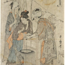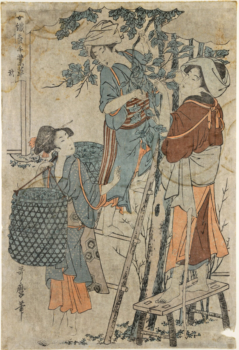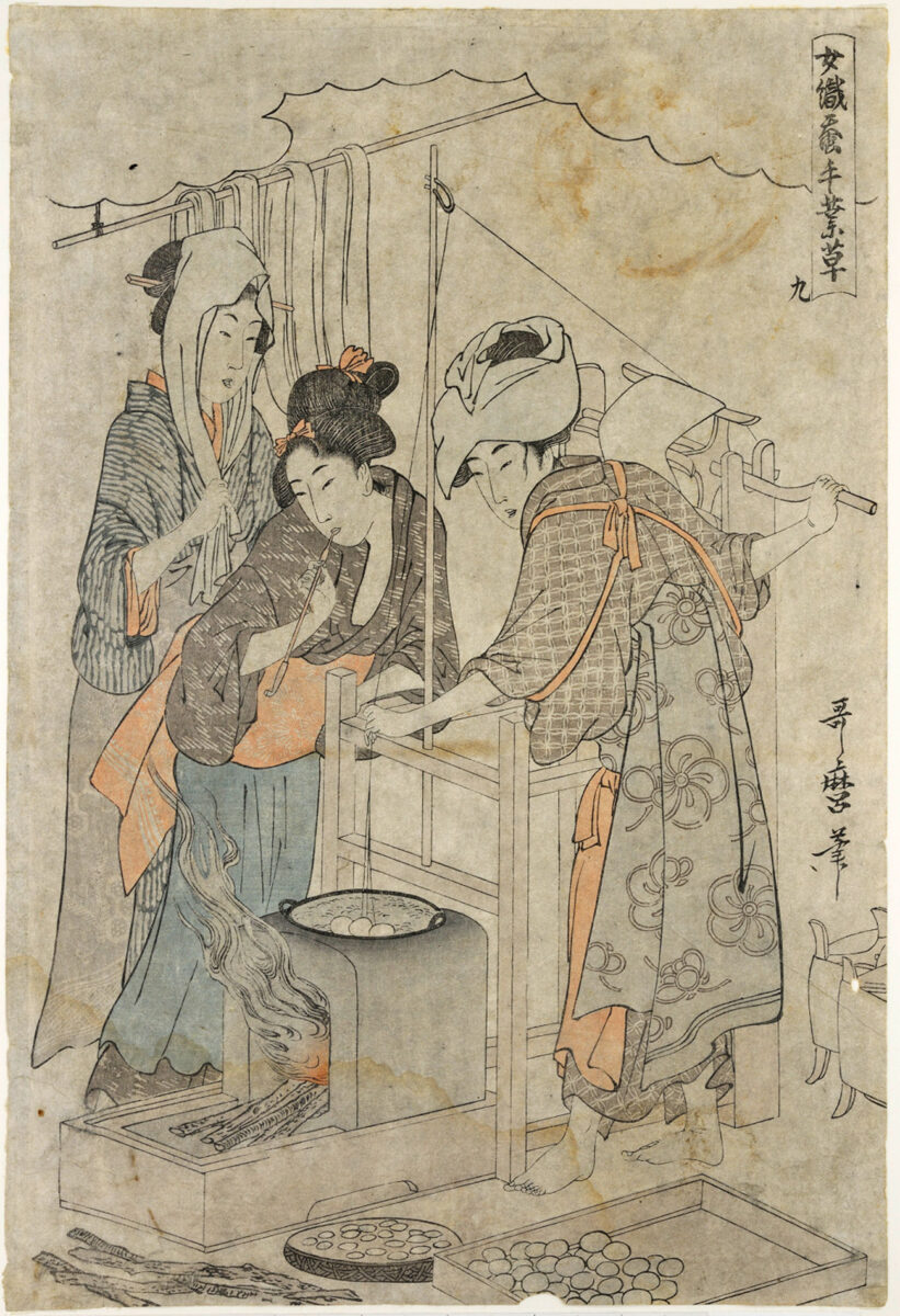 Δώδεκα έγχρωμες ξυλογραφίες του περίφημου καλλιτέχνη Kitagawa Utamaro, από τη σειρά «Η ενασχόληση των γυναικών με τη σηροτροφία», απεικονίζουν τα στάδια μιας παραγωγικής διαδικασίας που παραδοσιακά ανήκε στις γυναικείες εργασίες και αποτελούσε έναν από τους σημαντικότερους κλάδους της οικονομίας του Edo (σημερινό Τόκιο).