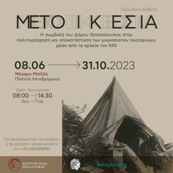 Η περιοδική έκθεση «Μετοικεσία» στο Κέντρο Ιστορίας Θεσσαλονίκης (Μέγαρο Μπίλλη) θα διαρκέσει έως τις 31 Οκτωβρίου 2023. Ώρες λειτουργίας από Δευτέρα έως Παρασκευή 8.00 – 14.30. Για απογευματινές επισκέψεις ή ξεναγήσεις επικοινωνία στο 2313318701.