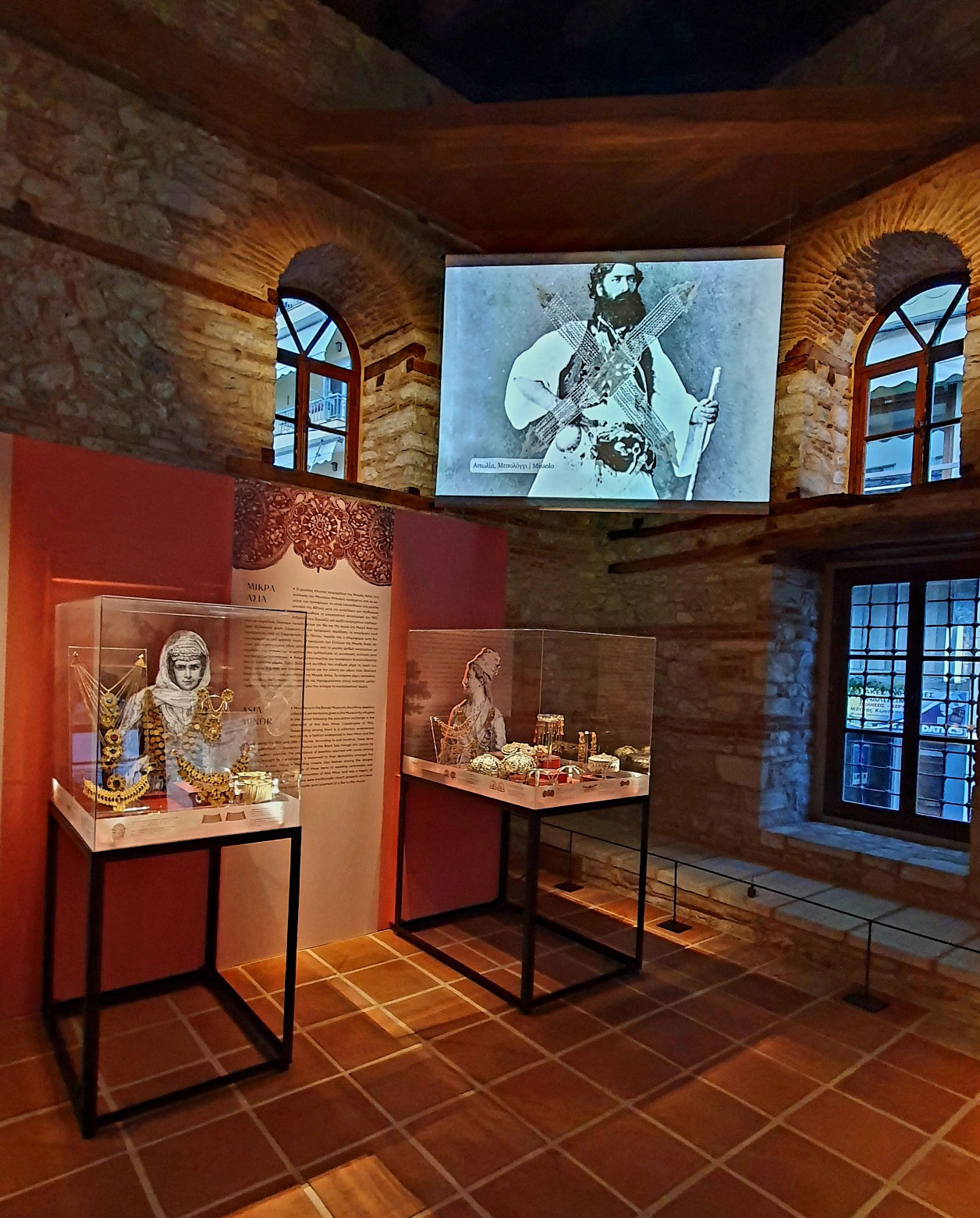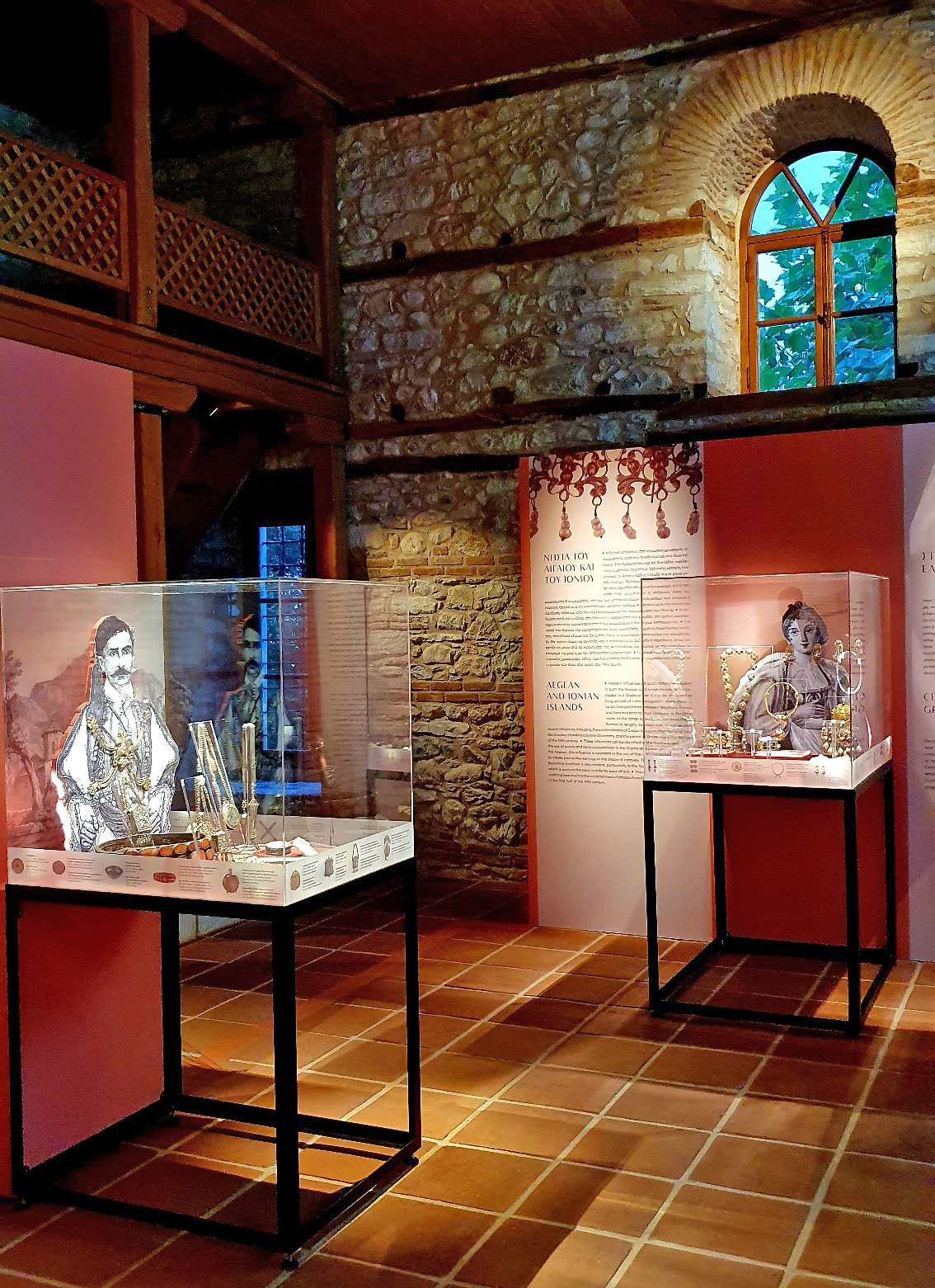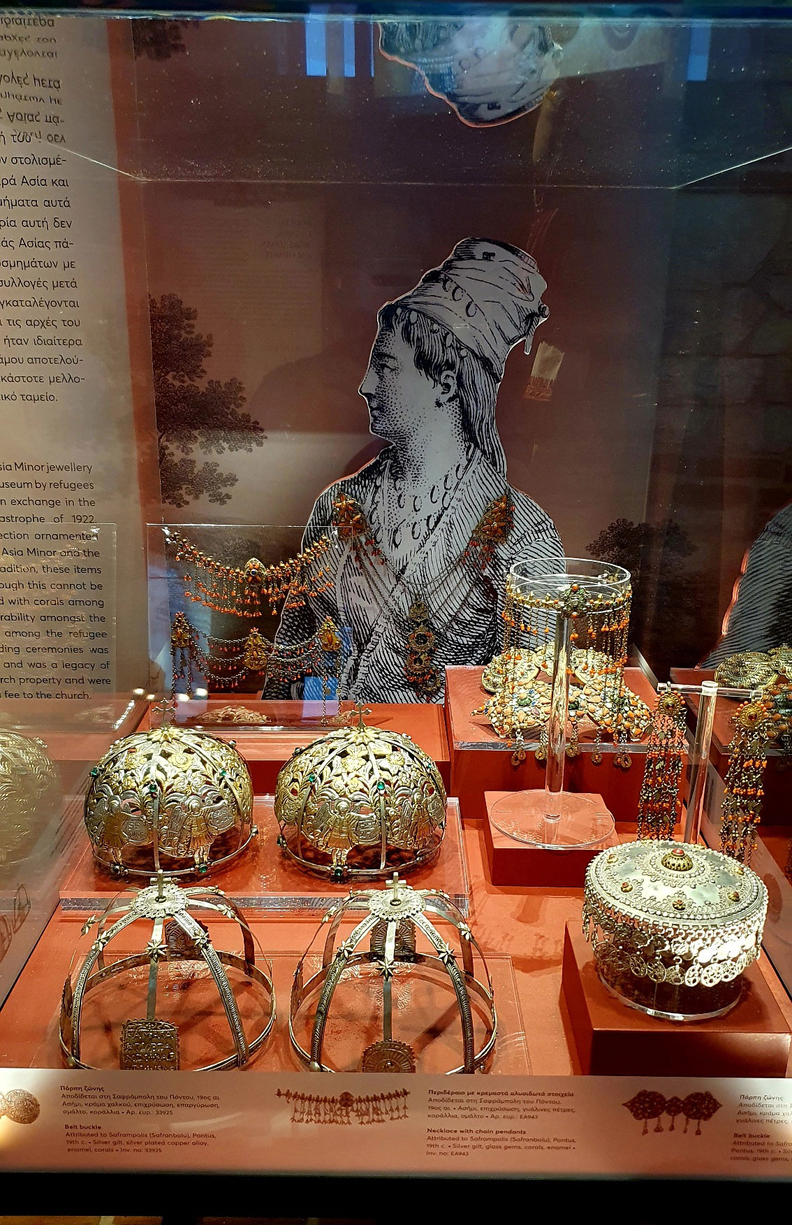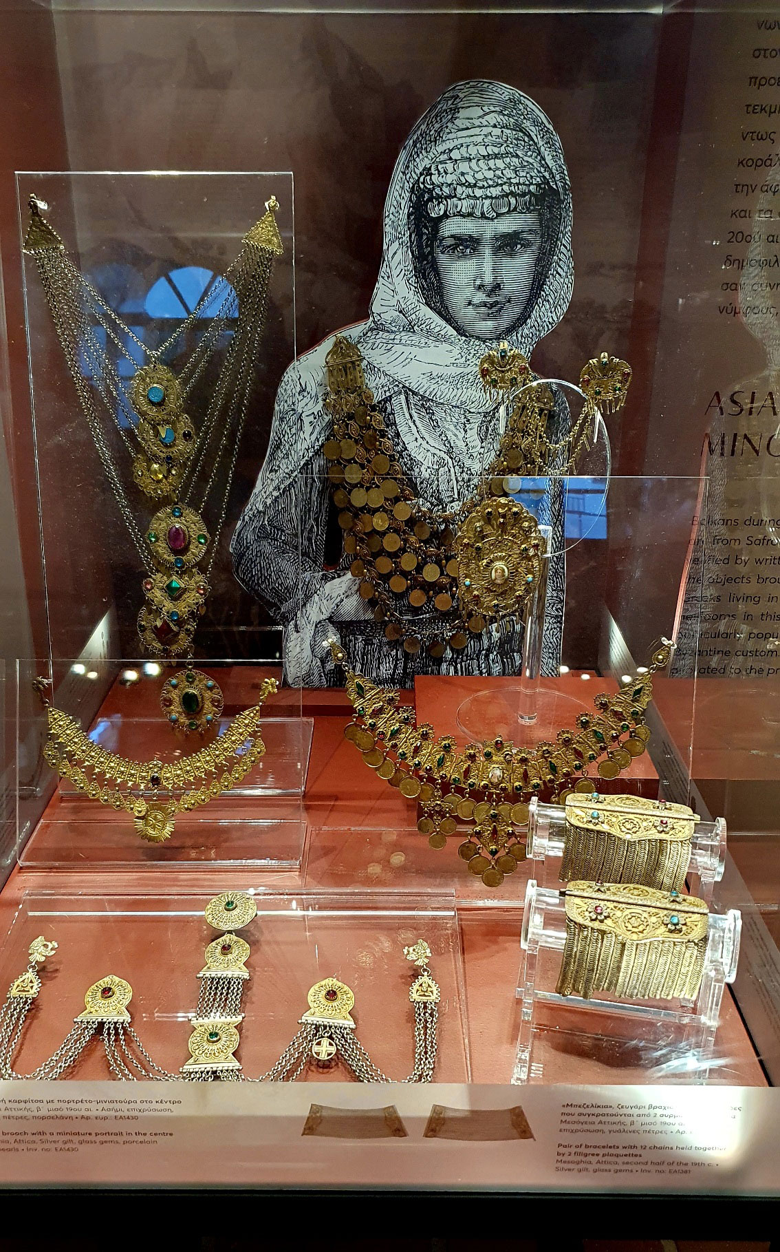 Από τα πιο εντυπωσιακά κομμάτια της συλλογής που εκτίθενται στις προθήκες είναι ένα περιδέραιο μήκους 64 εκ. από την Πάτμο του 18ου αιώνα, από χρυσό μαργαριτάρια και σμάλτο, ένα ζευγάρι σκουλαρίκια σε σχήμα καραβέλας του 18ου αιώνα από χρυσό, μαργαριτάρια και σμάλτο και ένα κόσμημα στήθους από τον Πόντο με ασήμι, κοράλλια και σμάλτο.