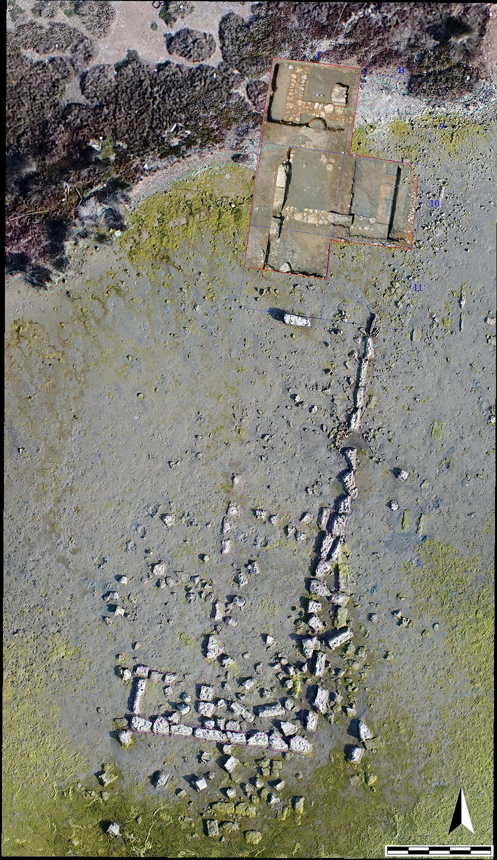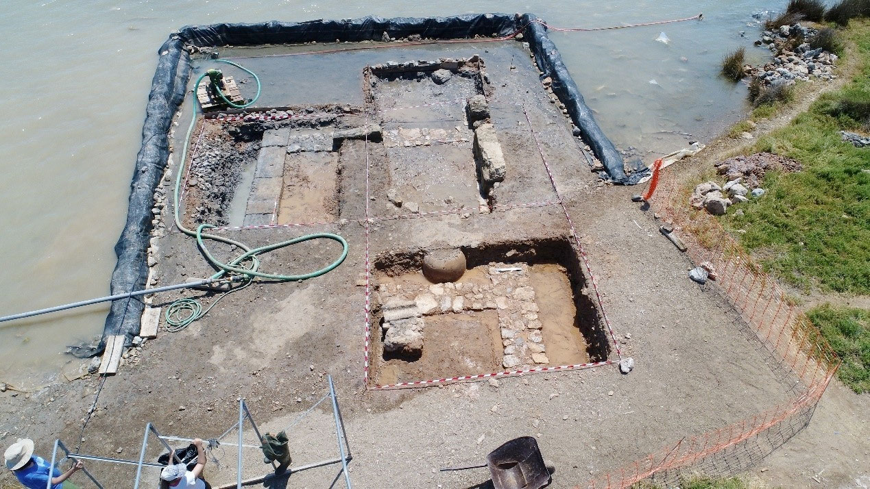 Η διερεύνηση του κτηρίου, βάσει κανάβου με τετράγωνα 4×4 μ., πραγματοποιήθηκε και πάλι με την εφαρμογή «αμφίβιας» ανασκαφικής διαδικασίας, η οποία συνδυάζει μέσα και τεχνικές της χερσαίας και υποβρύχιας αρχαιολογίας, και επιτεύχθηκε με την εγκατάσταση φράγματος και τη χρησιμοποίηση 2 υδραντλιών, για την καθημερινή αφυδάτωση θαλάσσιου πεδίου συνολικής εκτάσεως 60 τ.μ.