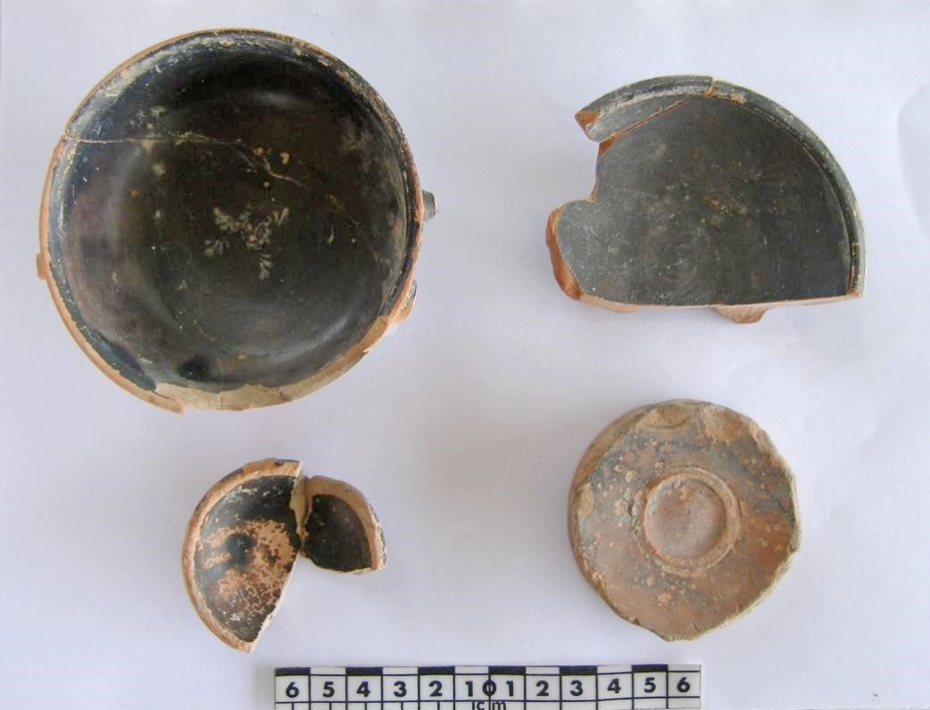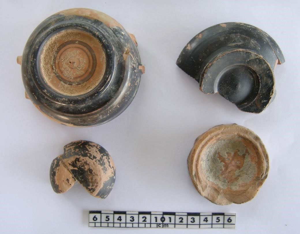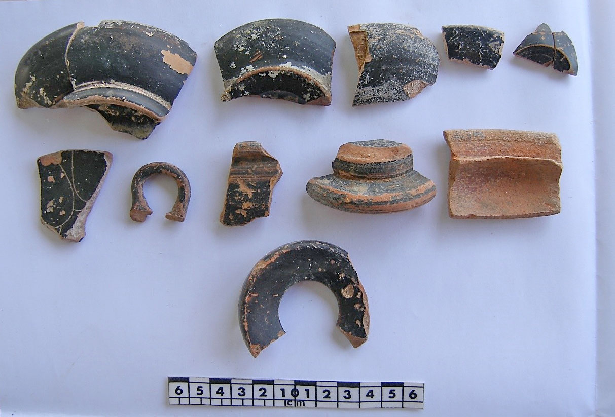 Στα κεραμικά ευρήματα που σχετίζονται με τη λειτουργία του κτηρίου περιλαμβάνονται άφθονα θραύσματα αγγείων διαφόρων ειδών και κεράμων της Κλασικής-Ελληνιστικής περιόδου. Σημαντικότερο είναι το σύνολο των Αθηναϊκών μελαμβαφών αγγείων και οστράκων της Ύστερης Κλασικής περιόδου (4ου αι. π.Χ.), από το επίπεδο χρήσης και θεμελίωσης του κτηρίου. Συνελέγησαν, επίσης, πολλά πήλινα αντικείμενα, κυρίως πώματα αμφορέων, θραύσματα μαρμάρινων αντικειμένων και 22 χάλκινα νομίσματα, Αθηναϊκά και άλλα.
