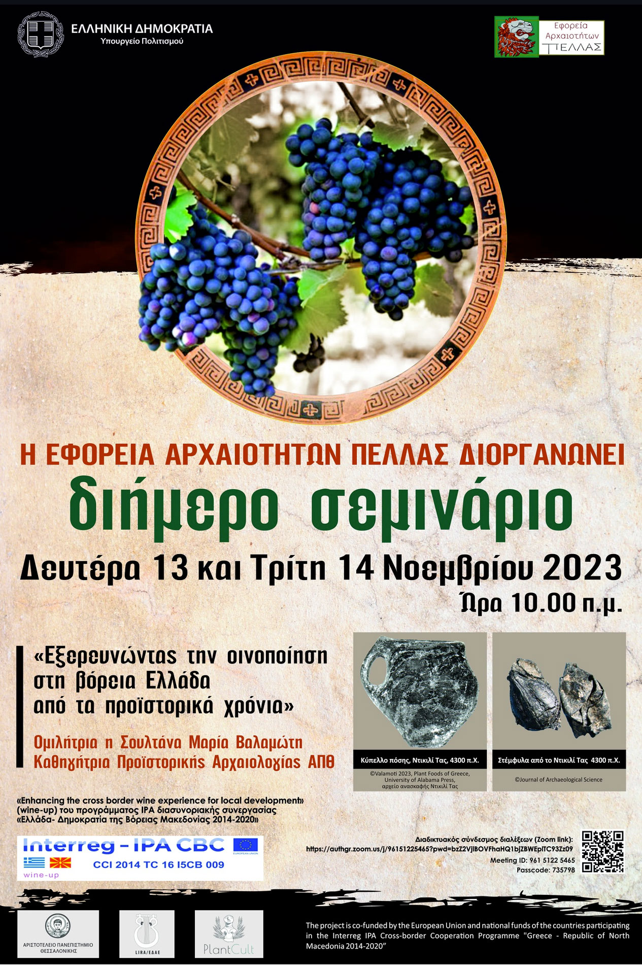 Διήμερο σεμινάριο που αφορά την αμπελοκαλλιέργεια και την αρχαιοβοτανική διοργανώνει η Εφορεία Αρχαιοτήτων Πέλλας τη Δευτέρα 13 και την Τρίτη 14 Νοεμβρίου 2023, και ώρα 10:00. Το σεμινάριο με τίτλο «Εξερευνώντας την οινοποίηση στη βόρεια Ελλάδα από τα προϊστορικά χρόνια» θα παρουσιάσει η Σουλτάνα Μαρία Βαλαμώτη (Καθηγήτρια Προϊστορικής Αρχαιολογίας, Διευθύντρια Τομέα Αρχαιολογίας, Διευθύντρια Εργαστηρίου Διεπιστημονικής Αρχαιολογικής Έρευνας- ΕΔΑΕ και PlantCult), ενώ θα συμμετέχει η Κ. Καρανικόλα (κάτοχος μεταπτυχιακού διπλώματος Προϊστορικής Αρχαιολογίας, ΑΠΘ).