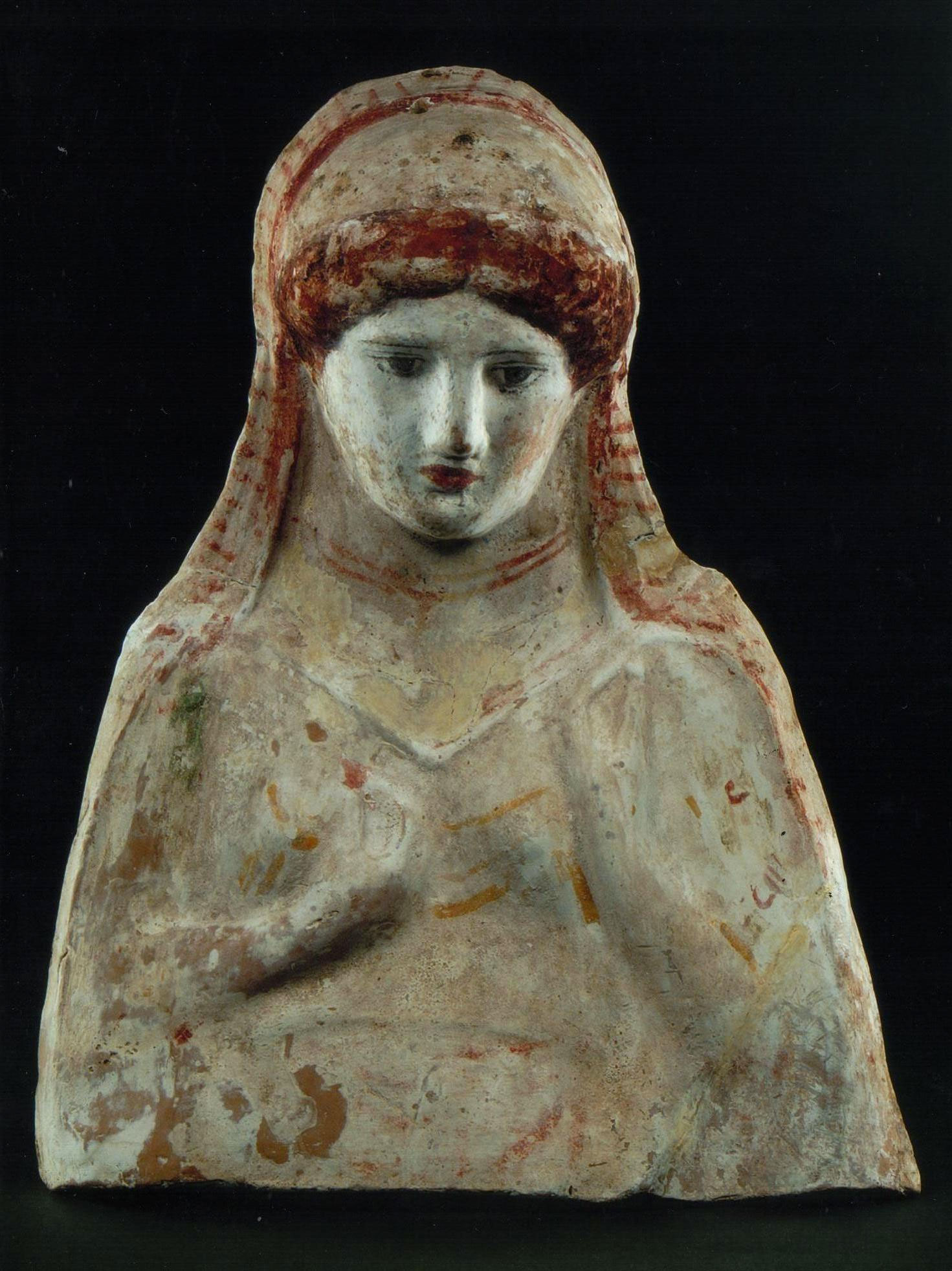 Η ανάρτηση του υπουργείου μεταξύ άλλων αναφέρει: «Η γυναικεία μορφή φορά χιτώνα και ιμάτιο που καλύπτει το πίσω μέρος του κεφαλιού και τους ώμους. Με κόκκινο χρώμα αποδίδονται λεπτομέρειες των υφασμάτων, το διπλό περιδέραιο στο λαιμό, το άνθος που κρατά με το δεξί της χέρι, τα μαλλιά και τα χείλη. Δυναμικές πινελιές μαύρου χρώματος στη σχεδίαση των ματιών αποδίδουν με εξαιρετική επιτυχία την έκφραση συγκρατημένης θλίψης. Το λευκό επίχρισμα τονίζει το ιδεώδες της ομορφιάς του δέρματος για την εποχή εκείνη. Παρόμοιες προτομές βρίσκονται σε σπίτια, σε ιερά και σε τάφους, πάντοτε ως αφιερώματα σε θεότητες που σχετίζονται με τη γονιμότητα, την αναπαραγωγή και την αναγέννηση της φύσης.