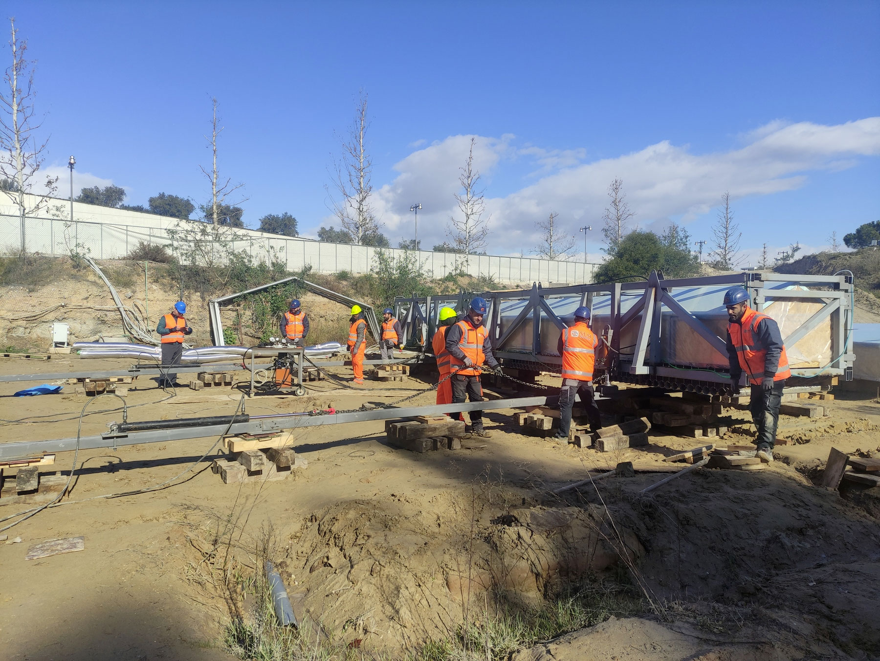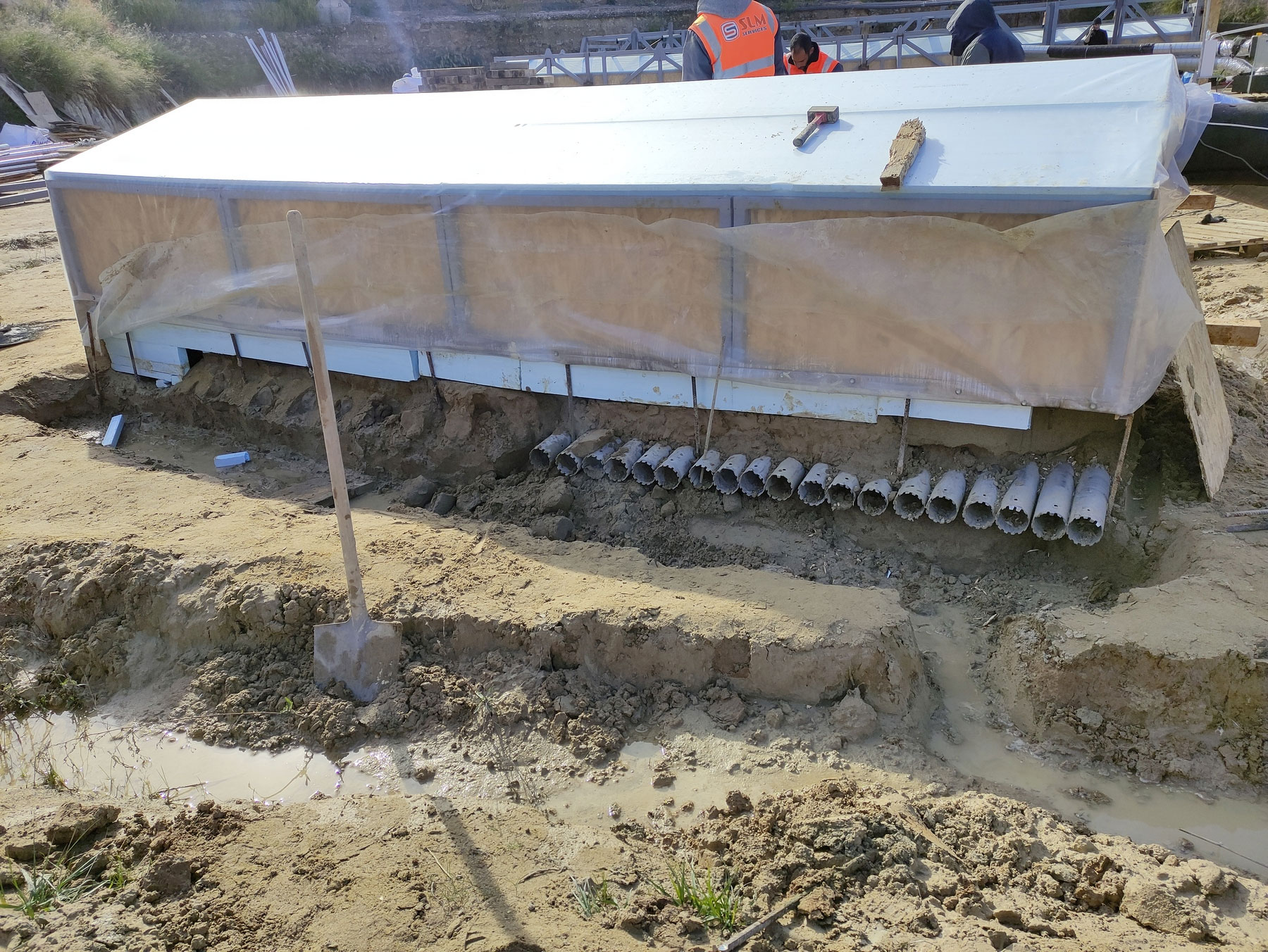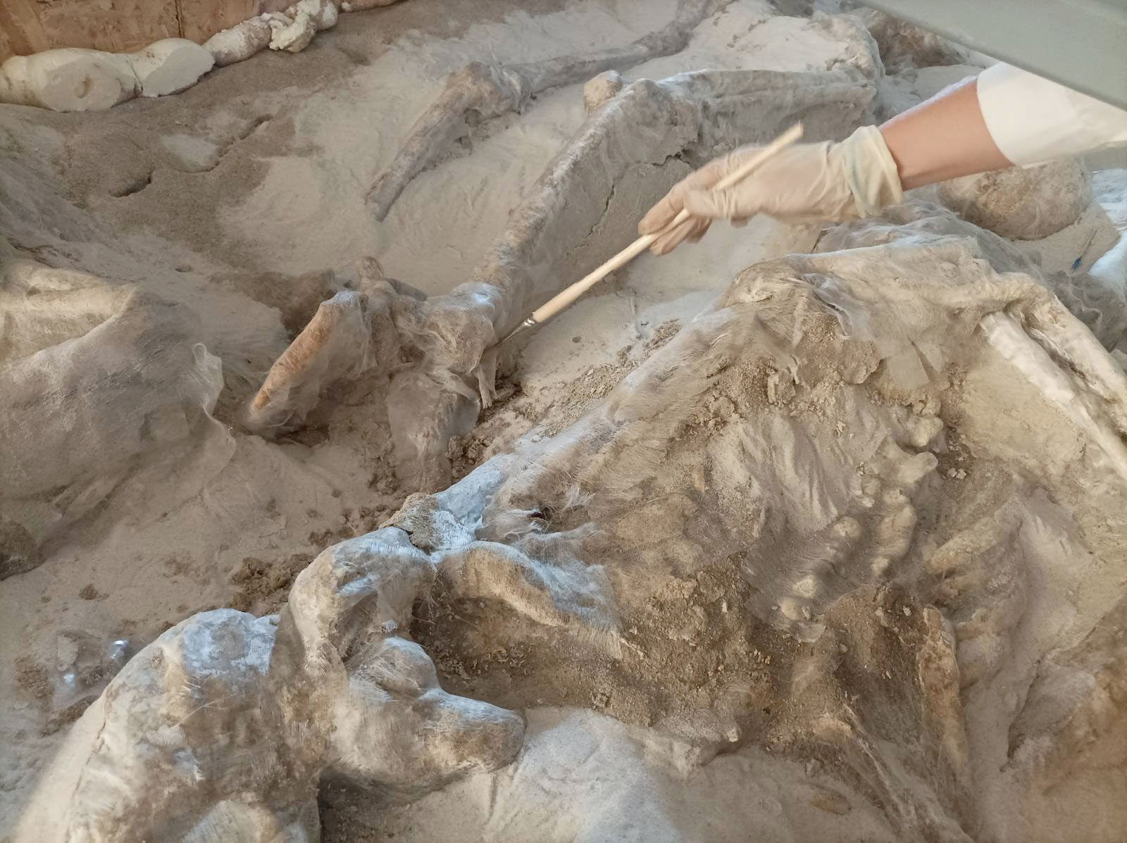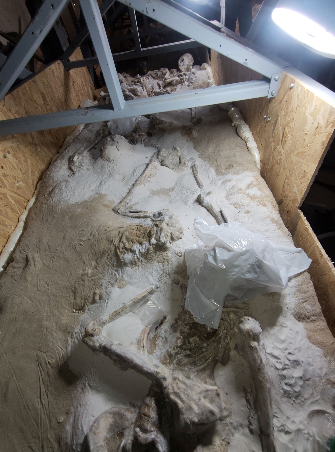 Από την αποκάλυψή του έως το τέλος του 2022, το οστεολογικό υλικό δεχόταν τη φροντίδα των συντηρητών της Εφορείας Αρχαιοτήτων κατά χώραν. Όμως, δεδομένων των περιβαλλοντικών συνθηκών, της γειτνίασης με τον υδροφόρο ορίζοντα, της συνεχούς ανερχόμενης υγρασίας, σε συνδυασμό με την ύπαρξη αλάτων και τη διαρκή ανακρυστάλλωσή τους, αποφασίστηκε –μετά την ομόφωνα θετική γνωμοδότησή του Κεντρικού Αρχαιολογικού Συμβουλίου– η προσωρινή μετακίνησή του από το χώρο εύρεσής του σε κατάλληλα διαμορφωμένη παρακείμενη θέση, επάνω σε υπόβαση σκυροδέματος. Οι εργασίες μετακίνησης έγιναν στις αρχές του 2023, με ολίσθηση επάνω σε σιδερένιες ράγες για τις δυο πρώτες συστάδες και από γερανοφόρο όχημα για την τρίτη συστάδα, αφού πρώτα το οστεολογικό υλικό εγκιβωτίστηκε σε ξύλινες κατασκευές και το σύνολο του ευρήματος συγκρατήθηκε με την κατασκευή μεταλλικού χωροδικτυώματος. Για τον έλεγχο των περιβαλλοντικών συνθηκών εγκαταστάθηκε εντός του προσωρινού κελύφους μηχανολογικός εξοπλισμός ύγρανσης-αφύγρανσης και κλιματισμού, ενώ οι συνθήκες καταγράφονται διαρκώς μέσω ηλεκτρονικών καταγραφέων.