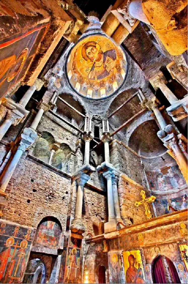 Η είσοδος στον ναό γίνεται από τη δυτική πλευρά, όπου μια ημικυκλική σκάλα οδηγεί στον νάρθηκα. Ο γλυπτός διάκοσμος του μνημείου παρουσιάζει πολυμορφία και πρωτοτυπία, κυρίως, λόγω των τόξων των καμαρών που στηρίζουν τον τρούλο. Ο ναός είχε αρχικά μαρμάρινο τέμπλο, που καταστράφηκε κατά τη διάρκεια της τουρκοκρατίας. Έφερε, επίσης, ψηφιδωτά που διακοσμούσαν τον τρούλο. Τα ψηφιδωτά χρονολογούνται στα τέλη του 13ου αιώνα. Στο ιερό και στους τοίχους του ισογείου του κυρίως ναού υπάρχουν τοιχογραφίες, οι οποίες έγιναν σε διαφορετικές εποχές, μετά την καταστροφή της ορθομαρμάρωσης που διακοσμούσε αρχικά τον ναό. Οι τοίχοι του κυρίως ναού είναι σήμερα αγιογραφημένοι με τοιχογραφίες που έγιναν σε δύο επάλληλα στρώματα. Από τις τοιχογραφίες του πρώτου στρώματος, που πιθανώς έγιναν την ίδια εποχή με αυτές του ιερού, διακρίνονται ελάχιστα ίχνη. Καλύτερα σώζονται οι τοιχογραφίες του δεύτερου και νεότερου στρώματος που διακοσμούν τους τοίχους του ισογείου. Οι τοιχογραφίες του κυρίως ναού δεν είναι χρονολογημένες. Οι τοιχογραφίες του δεύτερου στρώματος χρονολογούνται στο β’ μισό του 17ου αιώνα. Στο τέμπλο, οι τοιχογραφίες του παλαιότερου στρώματος πρέπει να είναι σύγχρονες με την εικονογράφηση του ιερού τον 16ο αιώνα. Στο δεύτερο στρώμα ανήκουν οι τοιχογραφίες των ολόσωμων αγίων που παρουσιάζουν αρκετές ομοιότητες με τις τοιχογραφίες του κυρίως ναού.