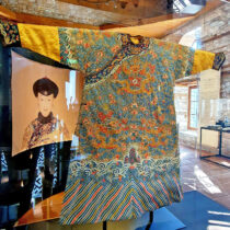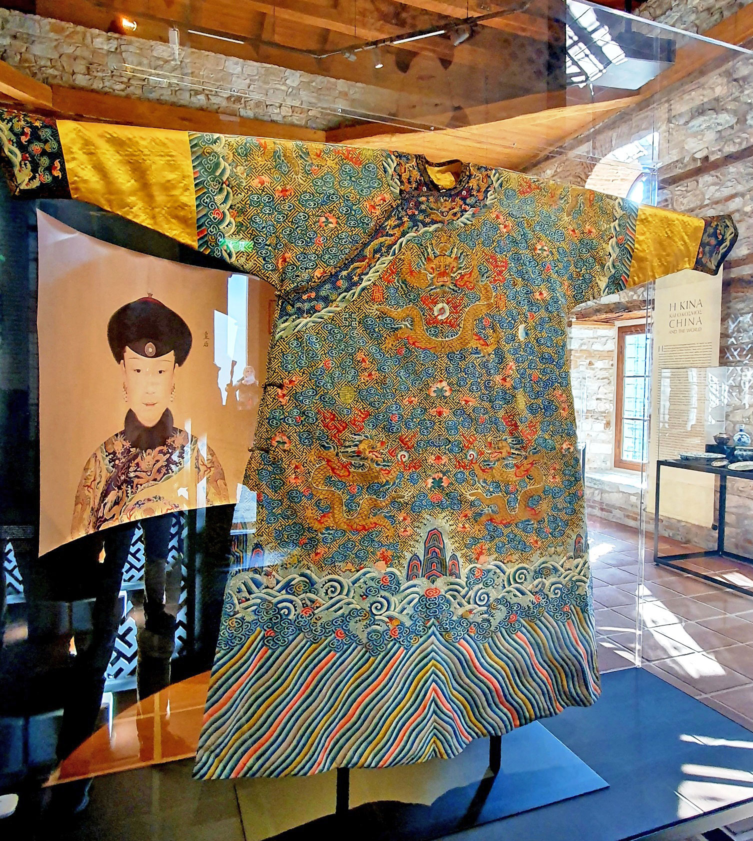Στην πρώτη ενότητα της έκθεσης εξετάζεται η αυτοκρατορική ιδεολογία. Μέσα από την ένδυση του αυτοκράτορα και μια εντυπωσιακή αυτοκρατορική ρόμπα που εκτίθεται στο Σαντιρβάν παρουσιάζεται ουσιαστικά η εξουσία μέσα στα 2.000 χρόνια ιστορίας της αυτοκρατορικής Κίνας. Το χαρακτηριστικό κίτρινο χρώμα της συμβολίζει το χρώμα του αυτοκράτορα. Επάνω της υπάρχουν κεντημένοι εννέα χρυσοί δράκοι και δώδεκα περίεργα σύμβολα τα οποία μπορούσε να φορά μόνο ο ίδιος.