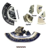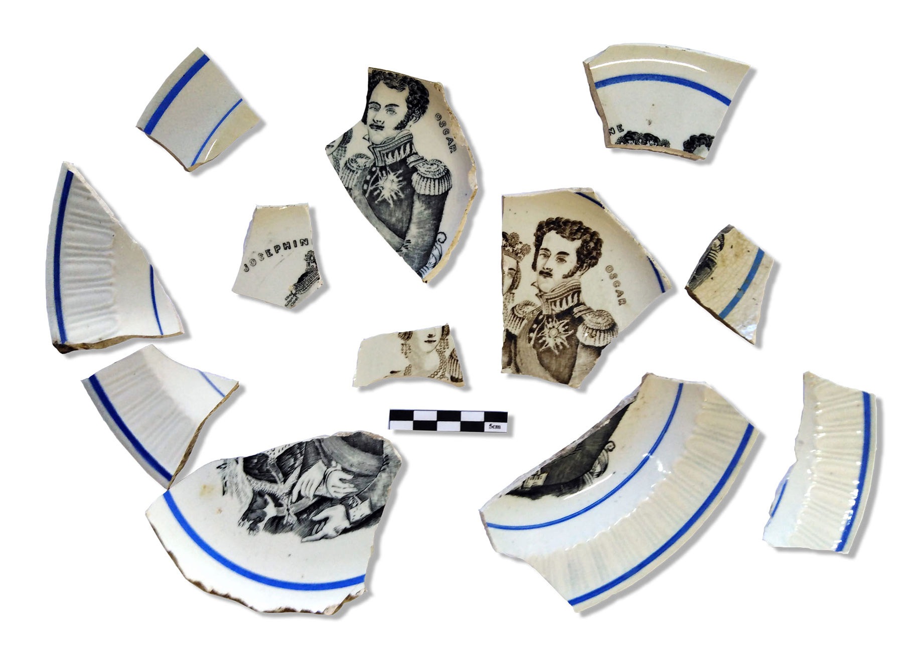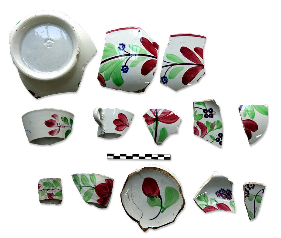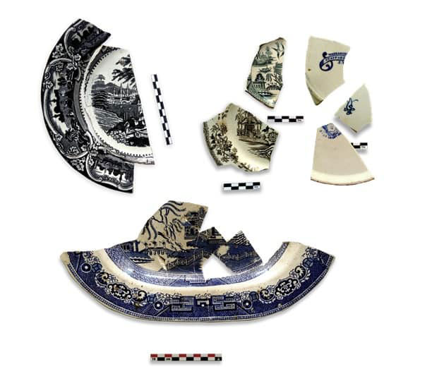 Τα είδη και ο διάκοσμος των κεραμικών σκευών παρουσιάζει αξιοσημείωτη ποικιλία. Μεγάλος αριθμός θραυσμάτων ανήκει σε σκεύη αγγλικών εργαστηρίων των περιοχών Staffordshire και Swansea και αποτελούν χαρακτηριστικά δείγματα δύο βασικών τεχνικών της διακόσμησης «transfer ware», γνωστών ως China Βlue και Flow Blue. Ως προς το θέμα του διακόσμου κυριαρχούν τα «Willow» και ο «Wild Rose Nuneham Courtnay», ενώ περιορισμένος αριθμός πιάτων φέρει παραστάσεις όπως η «Δαμασκός», η «Λαχώρη», ο «Βόσπορος» κ.ά. Θραύσματα τεσσάρων πιάτων εικονίζουν το βασιλικό ζεύγος της Σουηδίας, Όσκαρ και Ζοζεφίνα· επετειακό θέμα που κυκλοφόρησε με αφορμή την ανάρρησή τους στον θρόνο το 1844. Αγγλικής προέλευσης είναι και σκεύη με ανθικό διάκοσμο κατασκευασμένο με την τεχνική του σπόγγου (spongeware). Στην κατηγορία «Μocha» ανήκουν κούπες και ίσως κανάτες με χαρακτηριστικό διάκοσμο από επάλληλες ταινίες γαλάζιου, μπλε και πράσινου και το σχέδιο της σκακιέρας που διακρίνονται για το ιδιαίτερα στιλπνό υάλωμα και χρονολογούνται στα τέλη του 19ου αιώνα, όπως και θραύσματα από σετ πρωινού, τα οποία προορίζονταν κυρίως για τις αγορές των μεγάλων πόλεων της Τουρκίας στα Βαλκάνια και στην Ανατολή.
